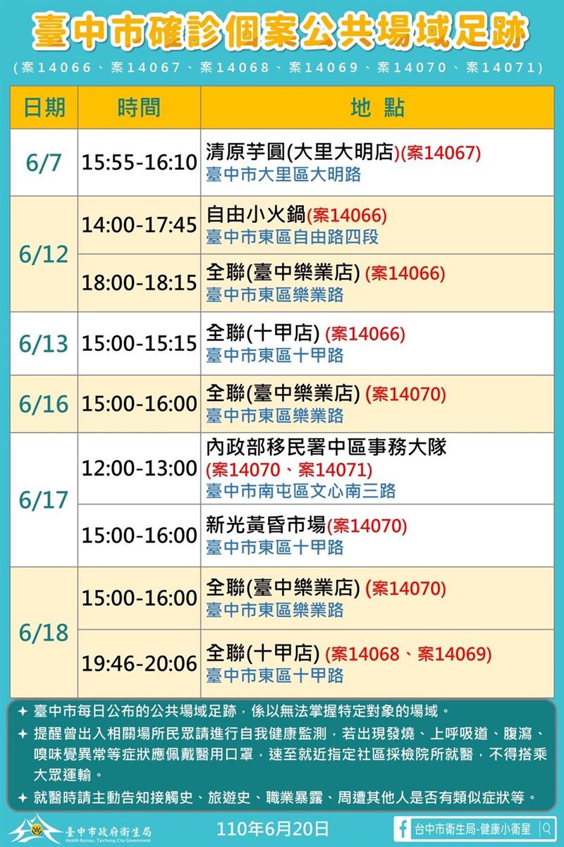 衛生局長曾梓展說明,案14066為東區44歲男性,昨日確診者案13994的先生,同樣在家族經營的「自由小火鍋」工作。5月20日後因店休未營業,多數時間在家,6月12日曾與妻子至店內一樓協助網購交貨,當日並至全聯台中樂業店購物,13日曾至全聯十甲店購物,15日開始出現不適症狀,18日因太太確診匡列為接觸者,19日採檢確診,部分行程因遺忘已申請手機軌跡及警政協尋。