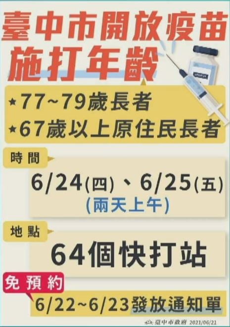 疫情嚴峻,市長盧秀燕昨(21)日宣布,6月24、25日兩日上午,將開放77歲至79歲長輩於全市64處快打站接種疫苗,明日將開始由里鄰長發放施打通知單,請民眾依單上時間及地點到站接種。