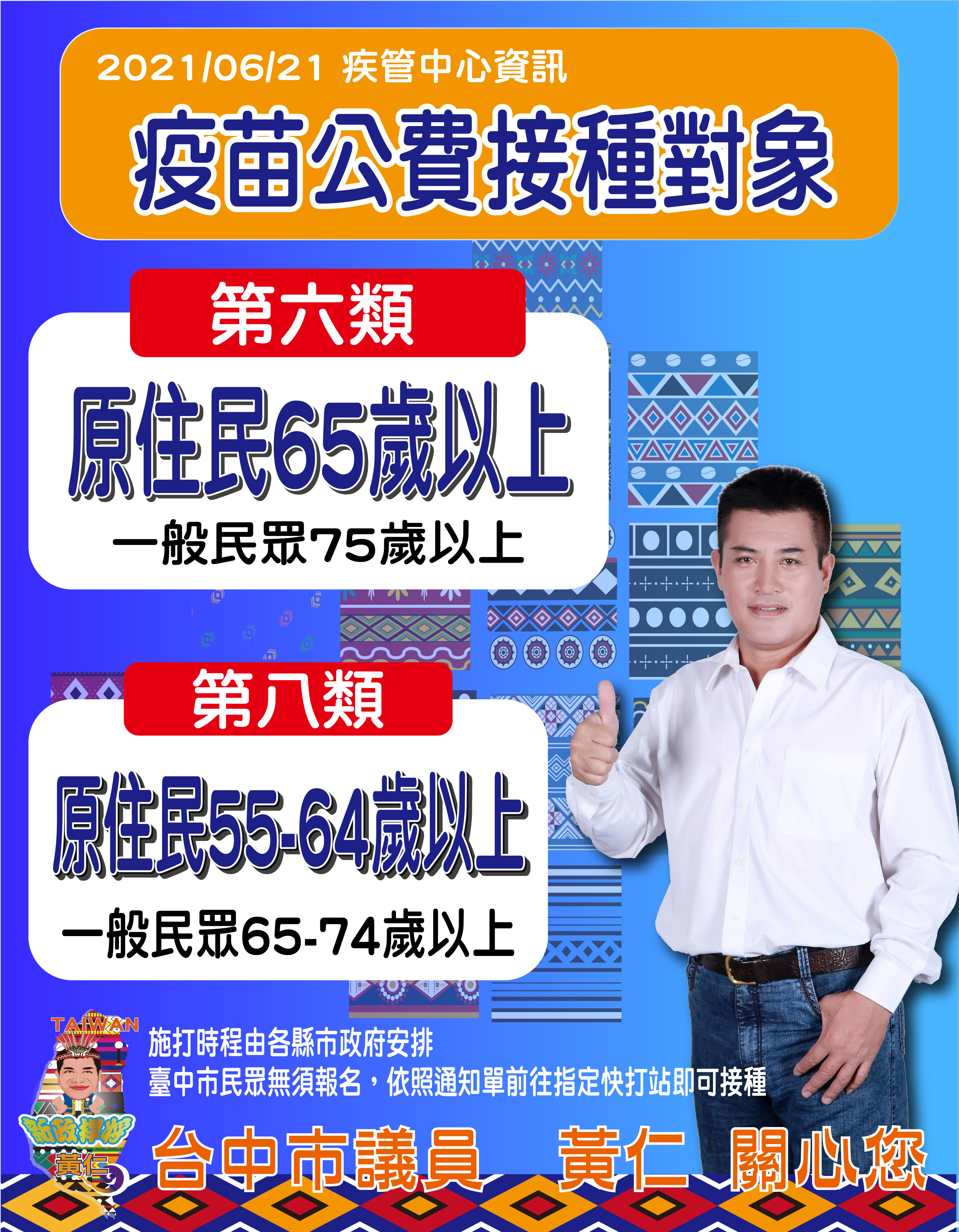 原住民議員黃仁表示,此次盧市長開放77-79歲長輩施打疫苗,原住民長輩則為67歲以上及可接種。黃議員再次呼籲,請長輩們待在家中就好,本次疫苗接種無須報名,依照通知單前往指定快打站即可接種。