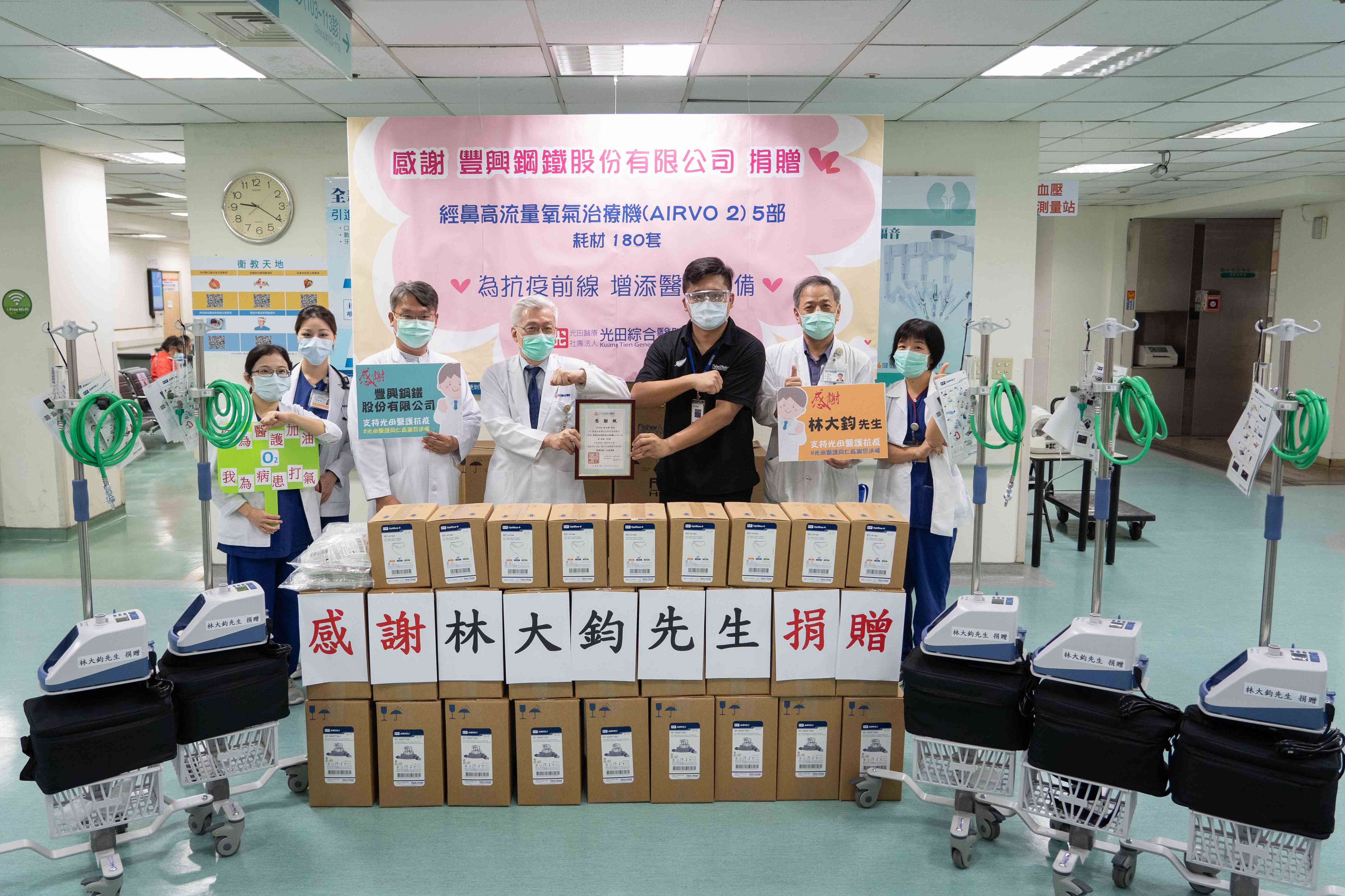 豐興鋼鐵公司董事長林明儒表示,疫情嚴重,重症患者急需救命神器呼吸系統,也希望能提高中部醫院防疫醫護能量,為對抗疫情盡一份心力,除了已捐贈市府防疫金及部分醫院儀器外,總經理林大鈞個人捐贈光田醫院5台的高流量氧氣治療機及耗材,善盡企業責任,全力支援協助台灣抗疫。