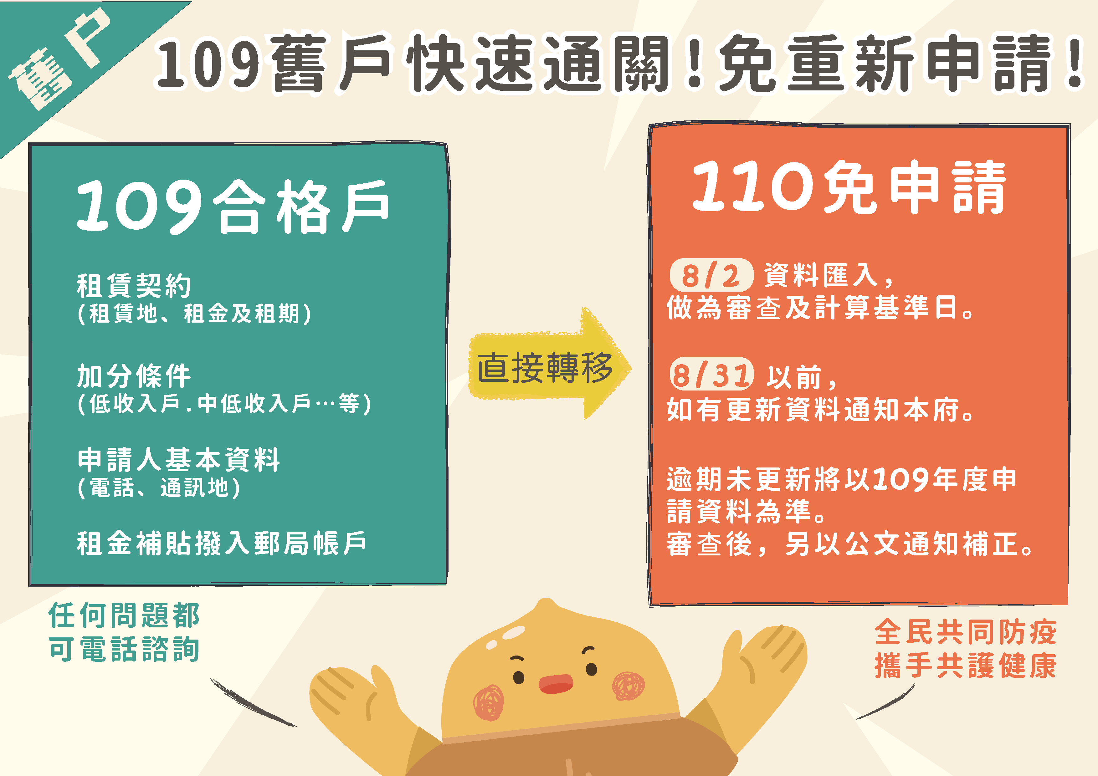 台中市住宅發展工程處表示,去年已申請的舊戶免提出申請,資料將續轉入今年住宅補貼申請案件,若舊戶不同意申請,請於7月10日前向住宅處提出放棄申請或不同意移轉申請書,若須更新資訊或新增身分別證明文件,請於8月31日前完成補件並送達住宅處,逾期未完成,將依去年度申請資料為審查依據。