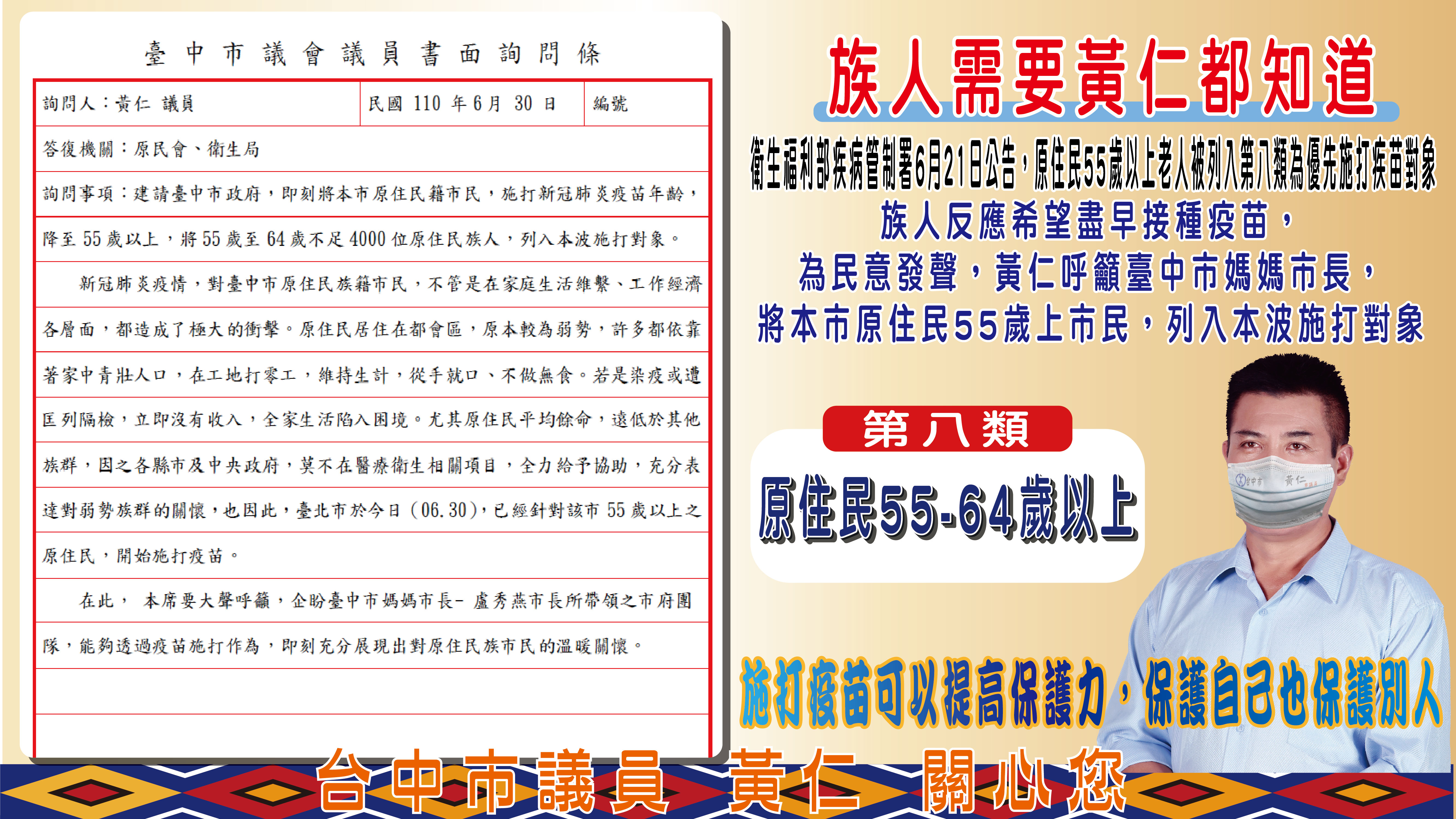 地方新聞臺中市原民議員黃仁呼籲符合施打疫苗者 應盡快接種提高保護力 榕嫻4 年 ago4 年 ago01 mins 【環衛新聞記者鄭榕嫻報導】 臺中市今日開始55歲以上原住民接種疫苗,符合接種資格的市議員黃仁獲通知,便立即安排前往指定快打站接受疫苗施打完成,目前狀況正常。 黃仁在此呼籲族人踴躍接受疫苗施打,提高自體保護力,保護您與家人、朋友。 提醒族人55歲以上原住民7/13-15接種疫苗,設籍臺中市民,一樣會造冊並發送 #疫苗通知單,依照上面的時間攜帶 身分證 及 健保卡 前往施打即可。 非設籍台中市55歲以上原住民可網路或電話預約。 #台中市議員黃仁關心您 #族人需要黃仁都知道 文章導覽 Previous: 保種護魚 台中食水嵙溪台灣白魚放流原棲地Next: 南投縣榮民服務處疫情間不忘關懷老榮民 發佈留言 取消回覆發佈留言必須填寫的電子郵件地址不會公開。 必填欄位標示為 *留言 * 顯示名稱 * 電子郵件地址 * 個人網站網址 在瀏覽器中儲存顯示名稱、電子郵件地址及個人網站網址,以供下次發佈留言時使用。