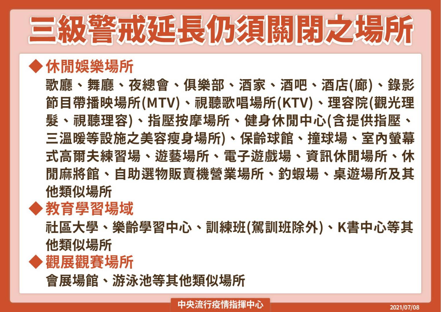 運動局說明,非屬此次體育署公告適度開放對象者,包含游泳池、保齡球館、撞球館等類似場所,仍應依三級警戒延長關閉至7月26日。