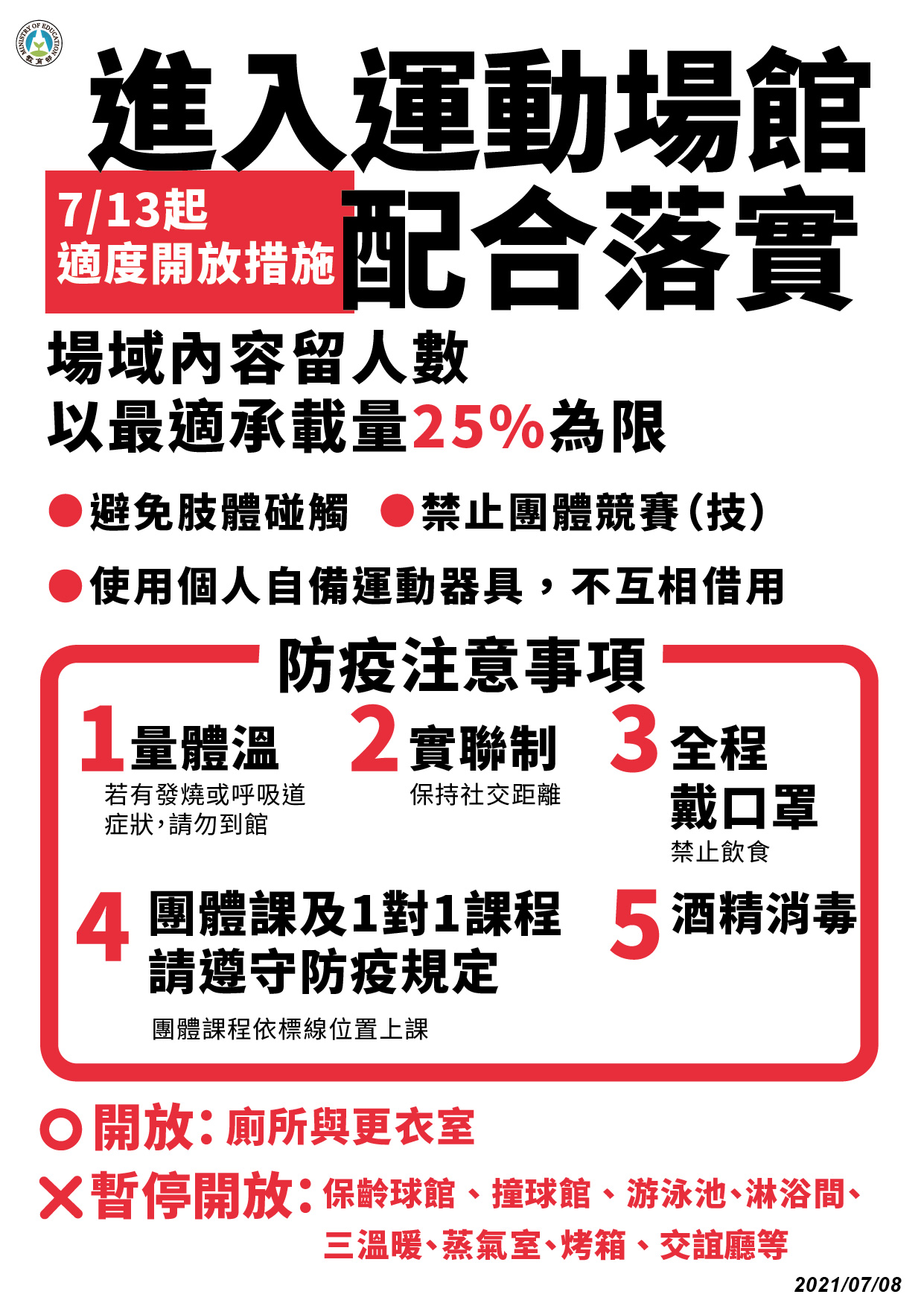 中央流行疫情指揮中心日前宣布室內外運動場館今日起至7/26可適度放寬,為兼顧防疫安全及民眾運動需求,台中市政府運動局適度放寬私人室內、外運動場館(健身房、運動中心、運動訓練班、羽球館、籃球館)及高爾夫球場,另公有運動場所(含國民運動中心、港區運動公園)除操場、步道外,原則仍配合三級警戒關閉至7月26日,以落實防疫政策。