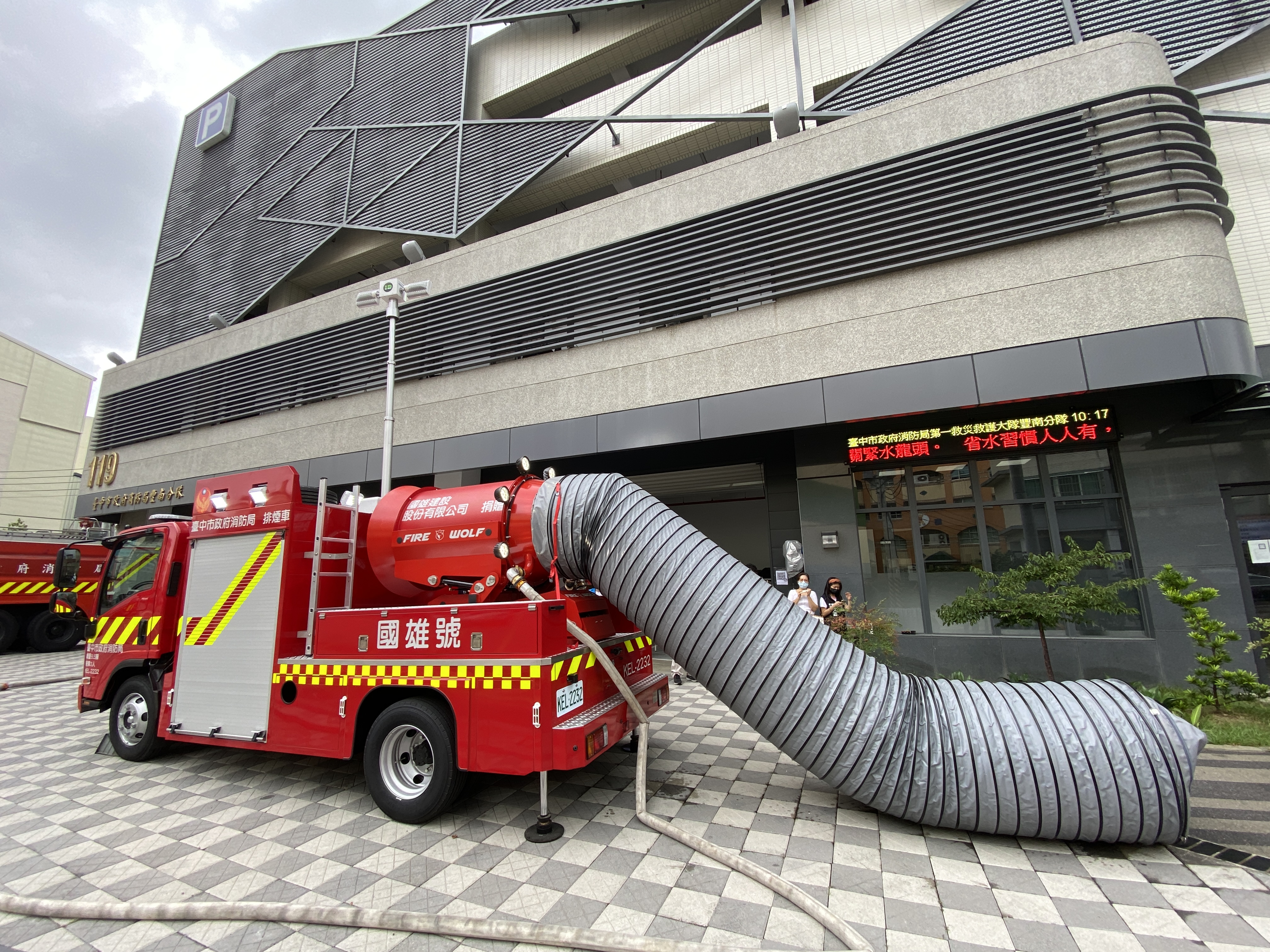 歷經八個月打造,台中首輛消防救災排煙車終於交車亮相!台中市議員黃馨慧、顏莉敏、張瀞分、陳政顯、陳成添、朱元宏、陳文政及李中等8位議員,今在交車儀式上共同見證「國雄號」排煙車展示各項救災強大功能,都不禁豎起大拇指稱讚,期待排煙車早日投入消防救災行列守護市民安全,未來對於隧道煙、市區大樓或地下室及人孔排煙等火災情境有相當助益。