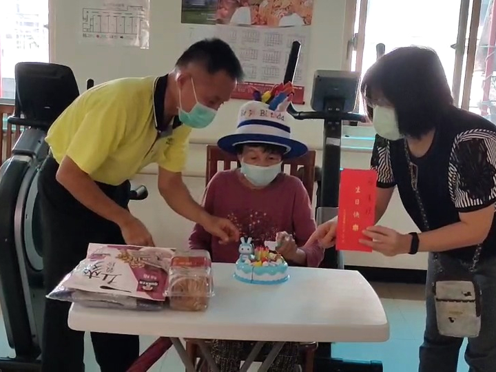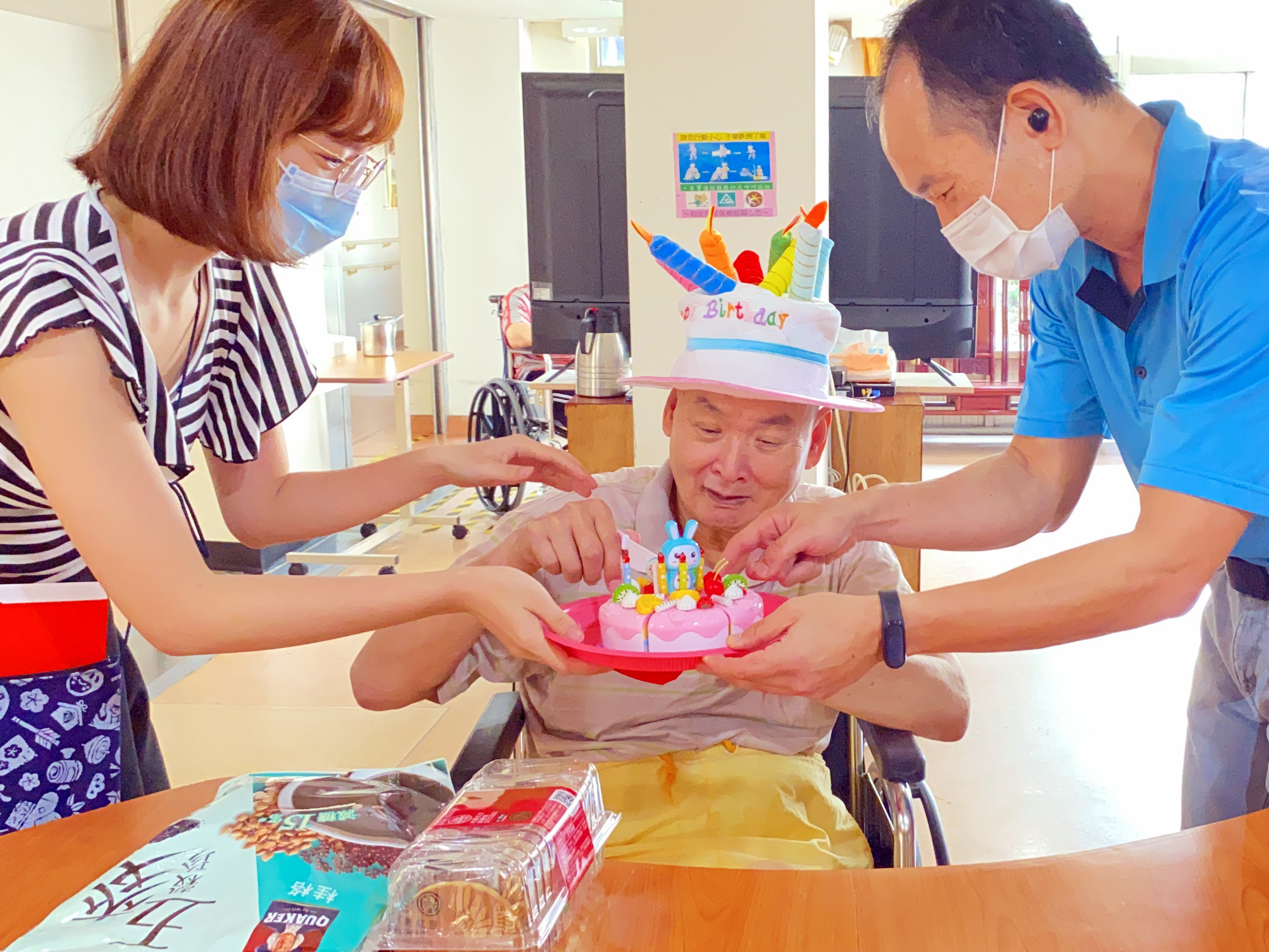 彰化榮民之家辦理7月份慶生活動,因疫情影響無法如往例一同歡聚、切蛋糕,特採小單元模式,由副主任何興隆及組室主管分別至五個堂隊辦理,播放黃埔壽歌、發放生日紅包與禮物,並以「蛋糕切切樂」玩具一同助興,讓每位長輩們都能開心歡度壽辰,排解因疫情所造成的鬱悶心情。
