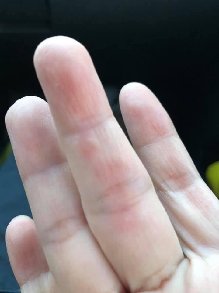 童綜合醫院的疫苗施打從今年3/22起迄今,每日施打人數越來越多,護理師每天都要服務接種數百民眾,不停地抽藥、消毒、按壓針筒、撕膠帶、衛教提醒等等,讓護理師們的手部乾燥、變皺、紅腫、水泡與破皮,聲音也都沙啞了。