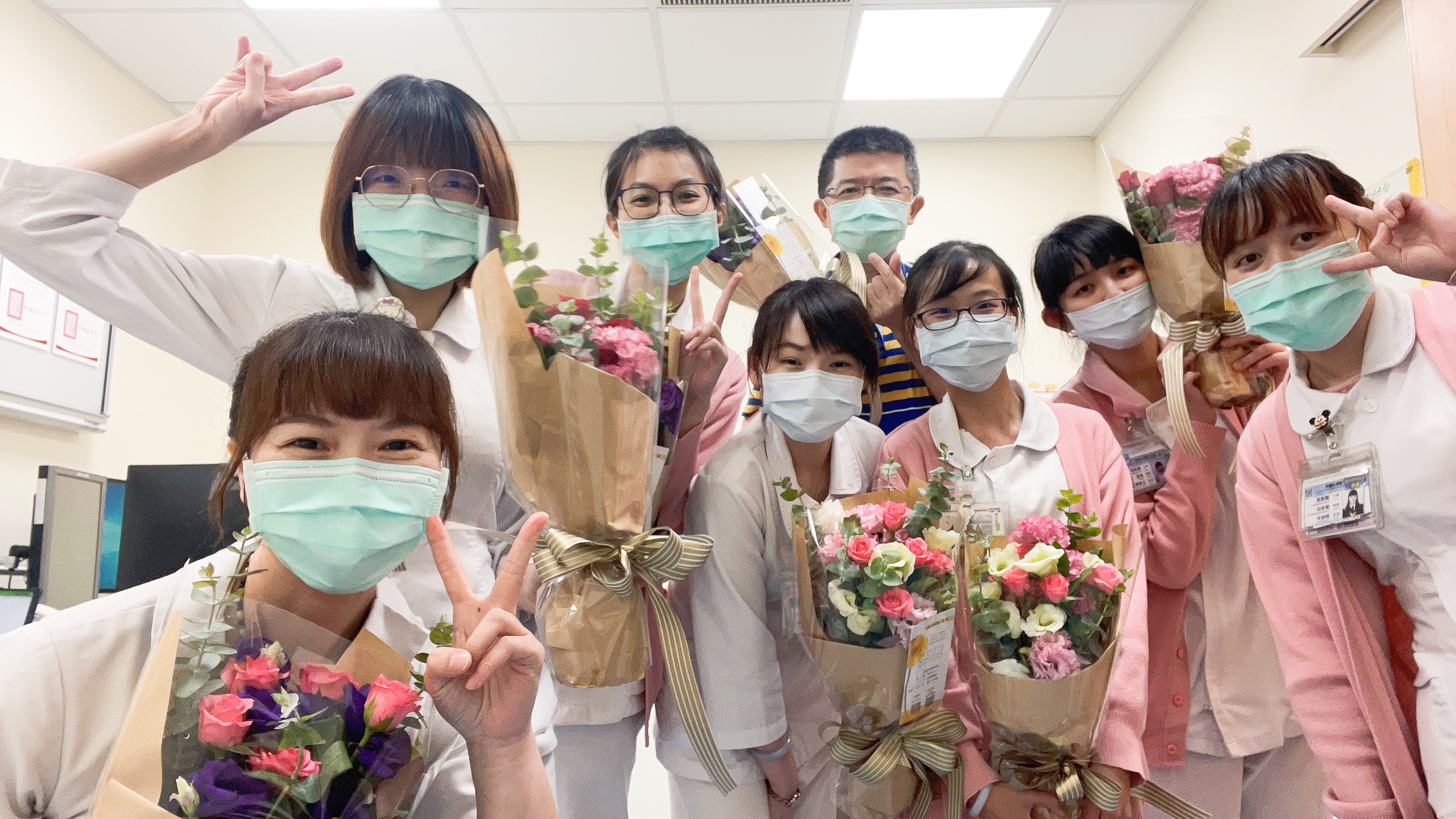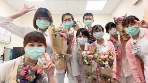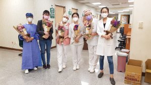 農委會農糧署與台灣花店協會合作,致贈100束花束給童綜合醫院,感謝第一線防疫人員辛勞,由童綜合醫院總院長童敏哲、副院長吳肇鑫代表,贈送給協助疫苗施打的護理師,感謝醫護人員們這段時間來的辛勤付出。
