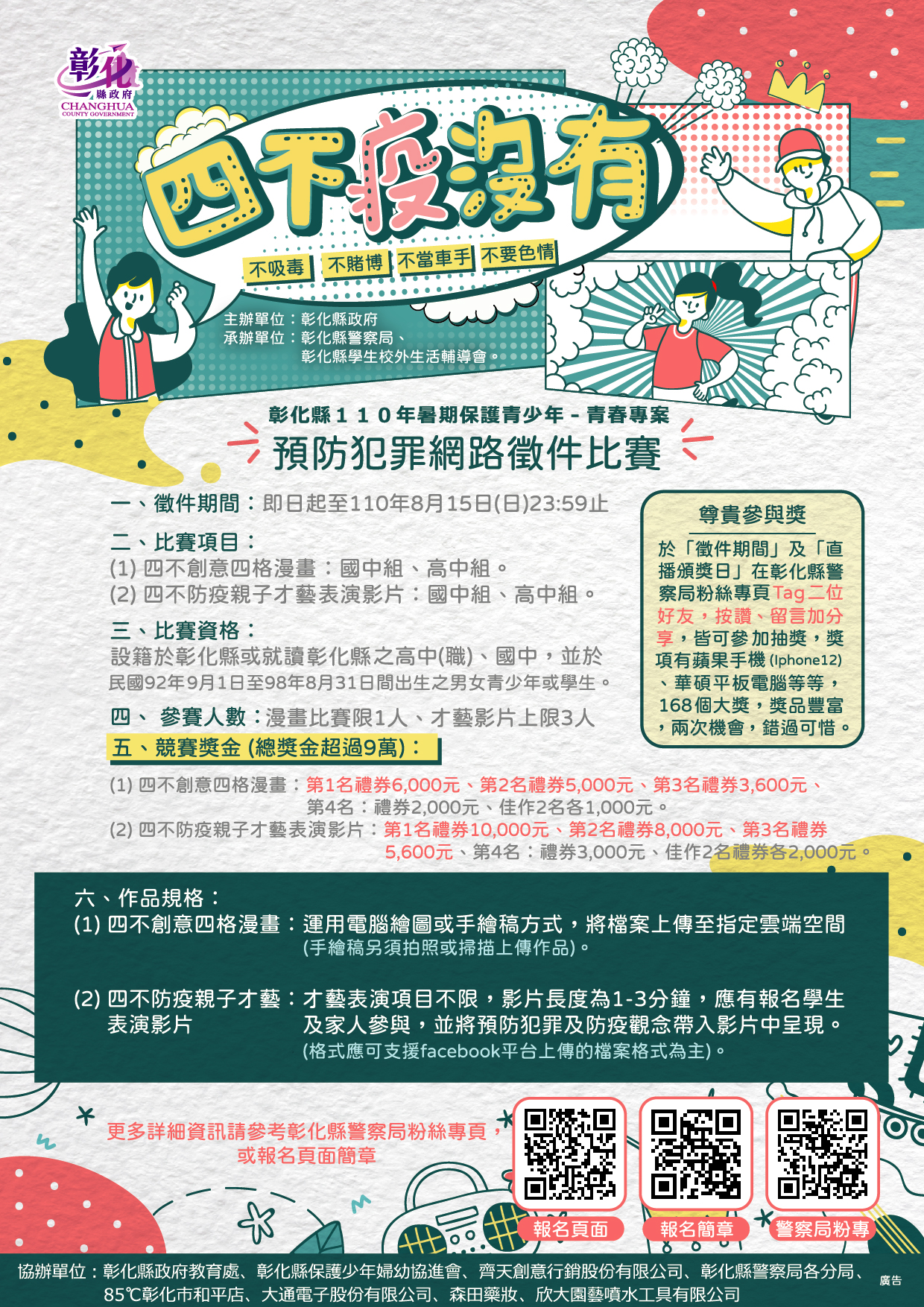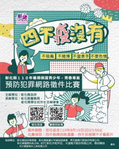 疫情降級暑期飆創意,報名參加彰化縣110年青春專案「四不〝疫〞沒有」徵件比賽,發揮自我創意換獎金,少年發揮自我來淘金,彰化縣為宣導犯罪預防觀念,暑假期間辦理「不吸毒、不賭博、不當車手、不要色情」等「四不〝疫〞沒有」預防犯罪創意徵件比賽。