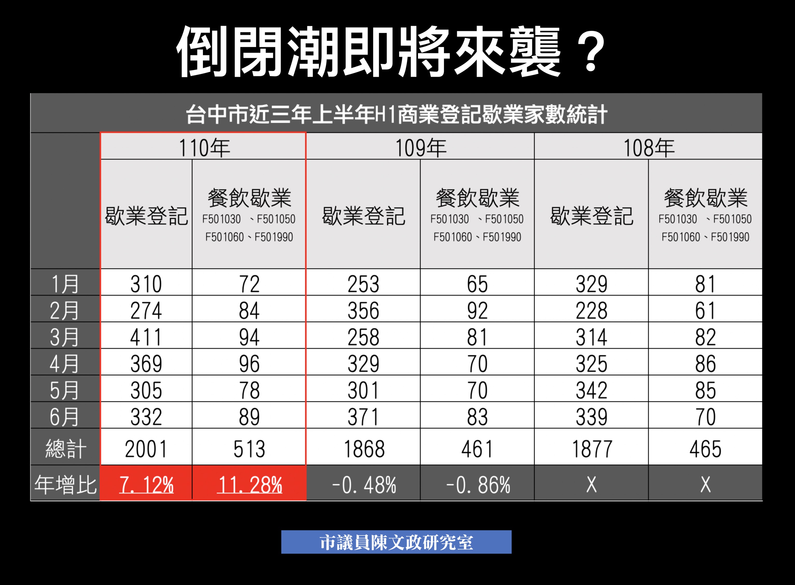 今日台中市議會進行財政經發質詢委員會,台中市議員陳文政拿出數據說明,110年上半年(1~6月)餐飲業申請歇業家數513家,比109年同期461家增加多達52家,暴增11.28%。陳文政說,業者會去申請歇業登記,代表已經撐不下去了,連最基本的稅賦都無法負擔,只好黯然倒閉。