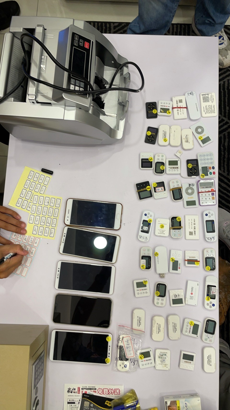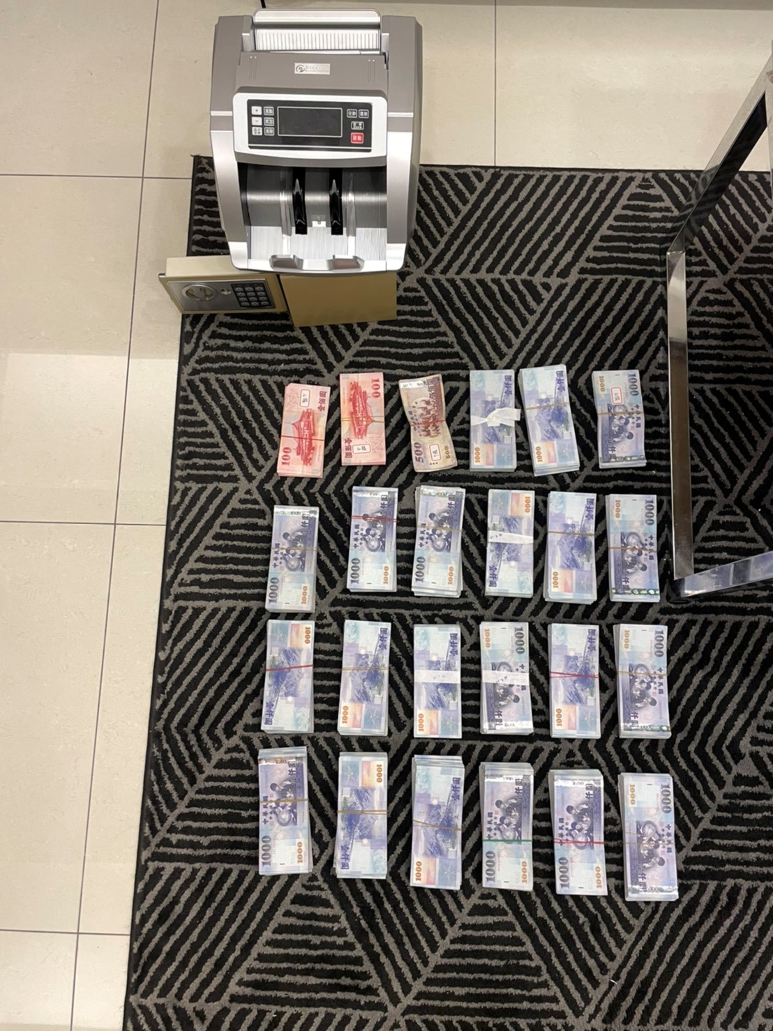 臺中市警察局第五分局偵查隊和刑警大隊科偵隊共同在實施轄內「淨樓專案」,一舉破獲以張姓嫌犯為首藏匿在社區內的博弈洗錢集團,現場及住所共計查扣現金新臺幣800萬餘元、手機49支、大陸銀行U盾70組、存摺、電腦主機、勞力士手錶、高級名車等證物及犯罪所得。