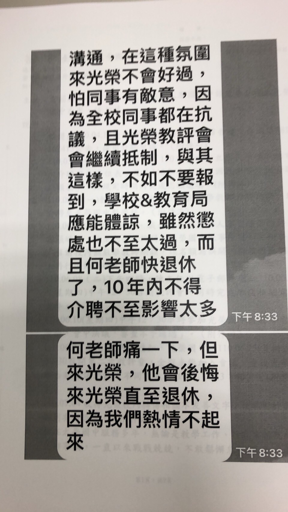 李中在今台中市議會業務質詢中指出,六月初他接獲東勢國中王老師陳情,表示依照介聘成績他應可調任至太平國中,但太平國中何老師不欲前往光榮國中報到,經深入調查後發現,太平國中何老師寧可被記過處分且接受十年內不得調動之嚴處,係因光榮國中教評會組織性惡意對待,並有威脅恐嚇之言辭,讓他心生恐懼故不敢前往。