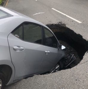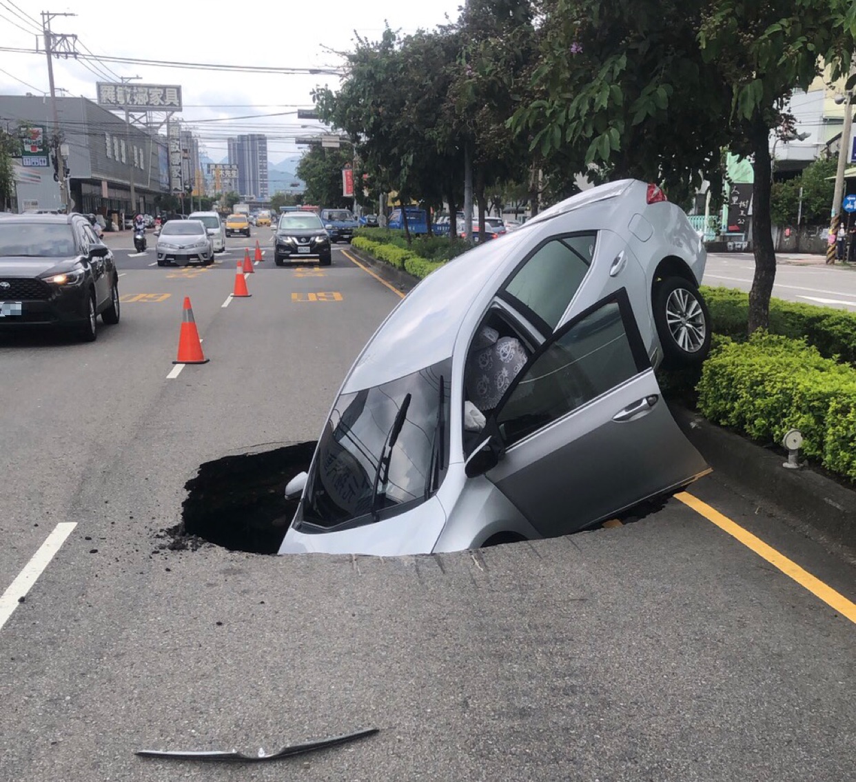 台中大里文心南路大晴天發生自小客栽進快車道天坑意外,一名66歲林姓女駕駛駕車經過,整個車頭陷入天坑,幸經住戶發現報警,她也自行脫困,經送醫無生命危險。當地里長也表示,該路段並非第一次出「大坑洞」。市長盧秀燕隨後也會同市議員羅廷瑋、建設局長陳大田、衛生局長曾梓展、民政局長吳世瑋均至醫院慰問傷者。