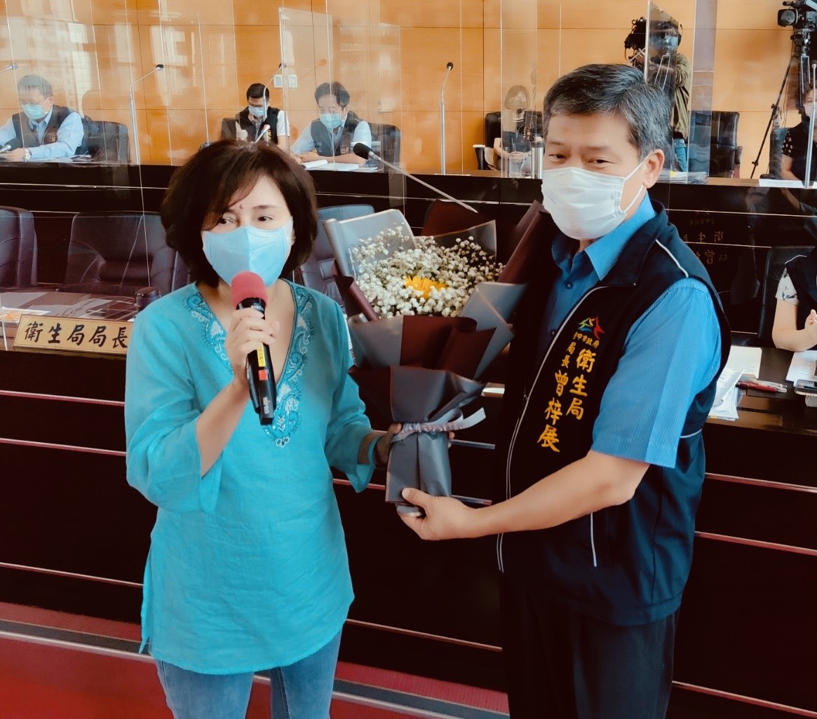全國警戒調降二級後,防疫人人自危,民眾盼打疫苗自保,台中市議員黃馨慧13日在議會送花給為了防疫瘦了三公斤的衛生局長曾梓展,台中確診數連續「嘉玲」,為防疫人員加油打氣,也為民眾發聲,疫苗登記唐鳳系統,預約月餘未收到簡訊通知心中恐慌,曾梓展回答,若已登記預約唐鳳系統卻未接獲通知,可電洽市府「1922專線」。