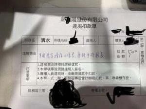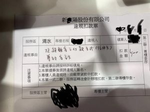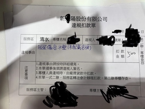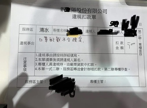 一名離職員工在Dcard發文,指國道3號清水服務區內一個櫃位的罰款制度,員工工作時因口罩沒戴好、未佩戴名牌、拒絕顧客付款方式導致客訴等,都被扣薪罰錢。清水服務區承包商新東陽公司表示,公司是針對廠商處分或罰款,但廠商不能扣員工的錢,將加強向員工及廠商業者進行宣導。台中市政府勞工局將派員到該廠商進行勞動條件檢查,確定違法最高可開罰100萬元。