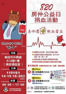 自疫情以來三級警戒,全臺血庫吃緊,8/14、15、16、20號,南投捐血室與房仲聯手做公益,8/20房仲公益日捐血活動,熱血常在。