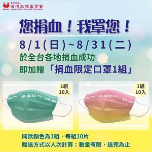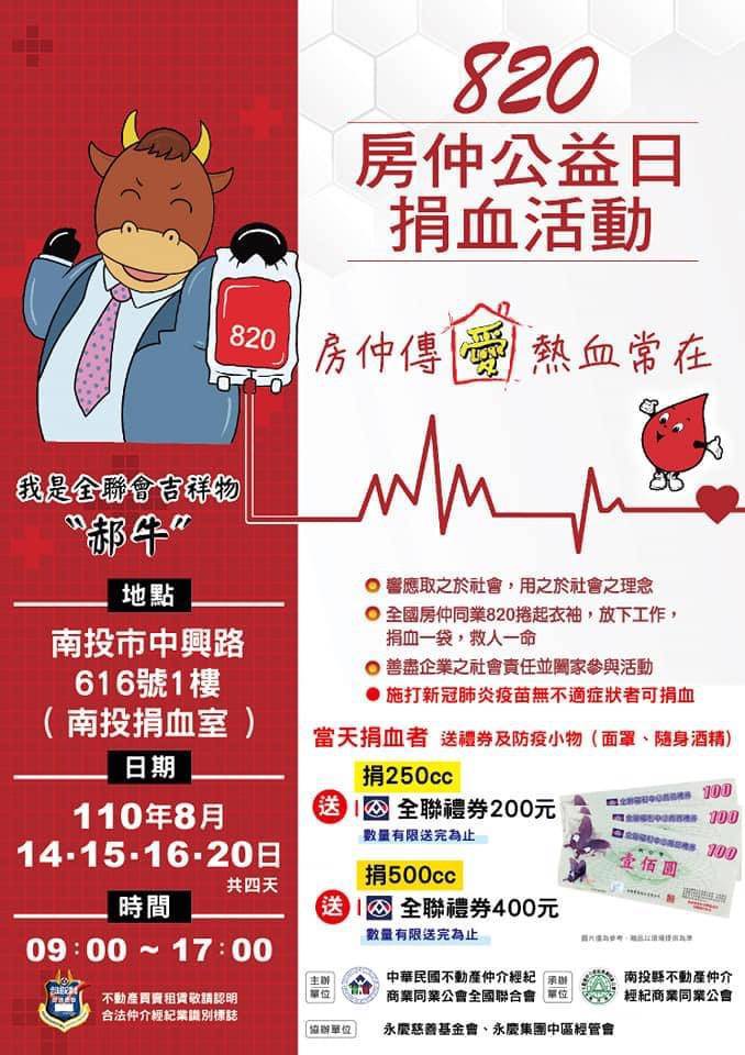 南投捐血室表示,為配合房仲公益日捐血活動,只要捐血者於8/14、15、16、20號,當天捐血者送全聯禮卷(250cc送200全聯禮卷、500cc送400全聯禮卷及隨身防疫小物品),捐血除了幫助人也可以促進血液新城代謝。