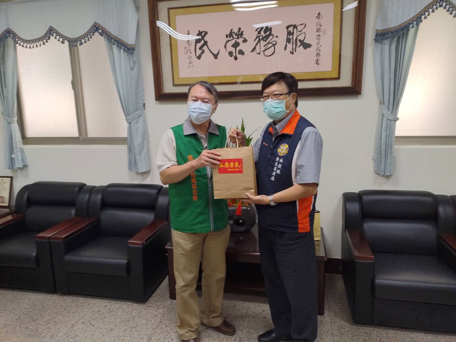 政府資源有限、民間力量無窮,財團法人張榮發基金會黃敬忠副理與夏塘昱專員,前往南投縣榮服處,處長邱奇賢熱情接待並致贈印有書法大師李穀摩老師墨寶「服務榮民」字樣的茶杯組,感謝基金會長期關懷扶助轄內榮民眷。