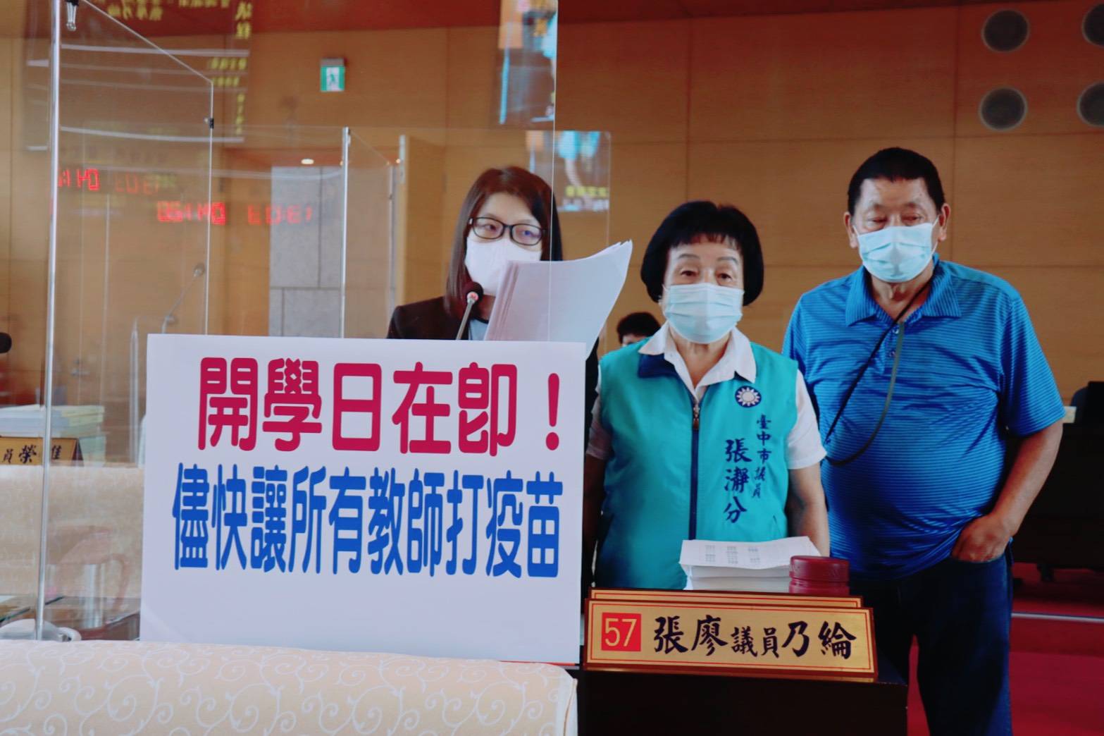 市議員張廖乃綸進一步指出,學校停課這麼久,線上教學亂象頻傳,家長、老師和學生都很關切到底高中職及國中小9月能不能如期開學,先前教育局統計,國高中、國小老師及及補教人員,大約還有八千多人還沒打疫苗,這部分衛生局要盡快安排施打。衛生局長曾梓展說,中央原先回報台中市造冊的老師還有二千多人沒打疫苗,但教育局重新整理造冊後約有八千多名老師沒打疫苗,衛生局會努力盡快安排施打。