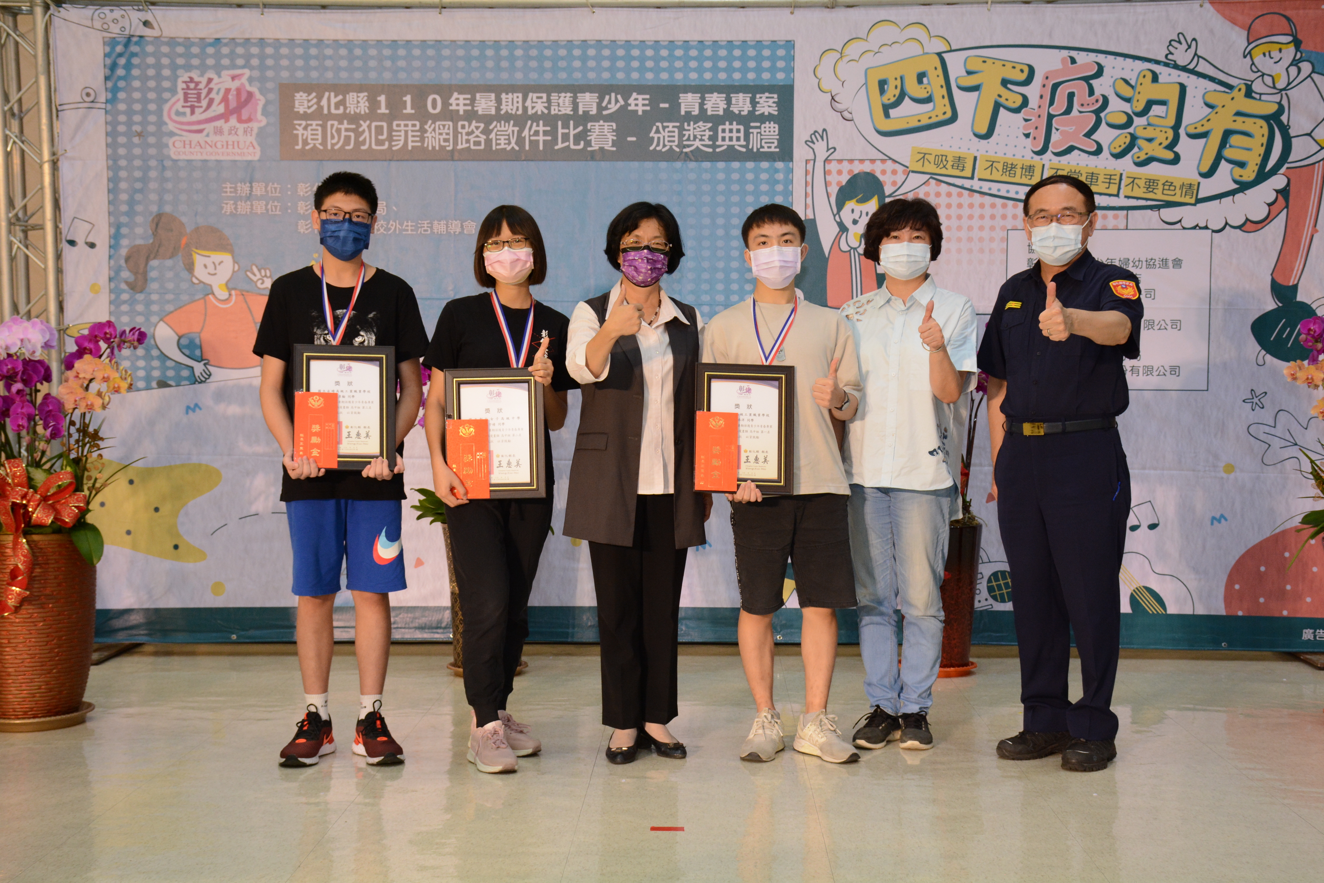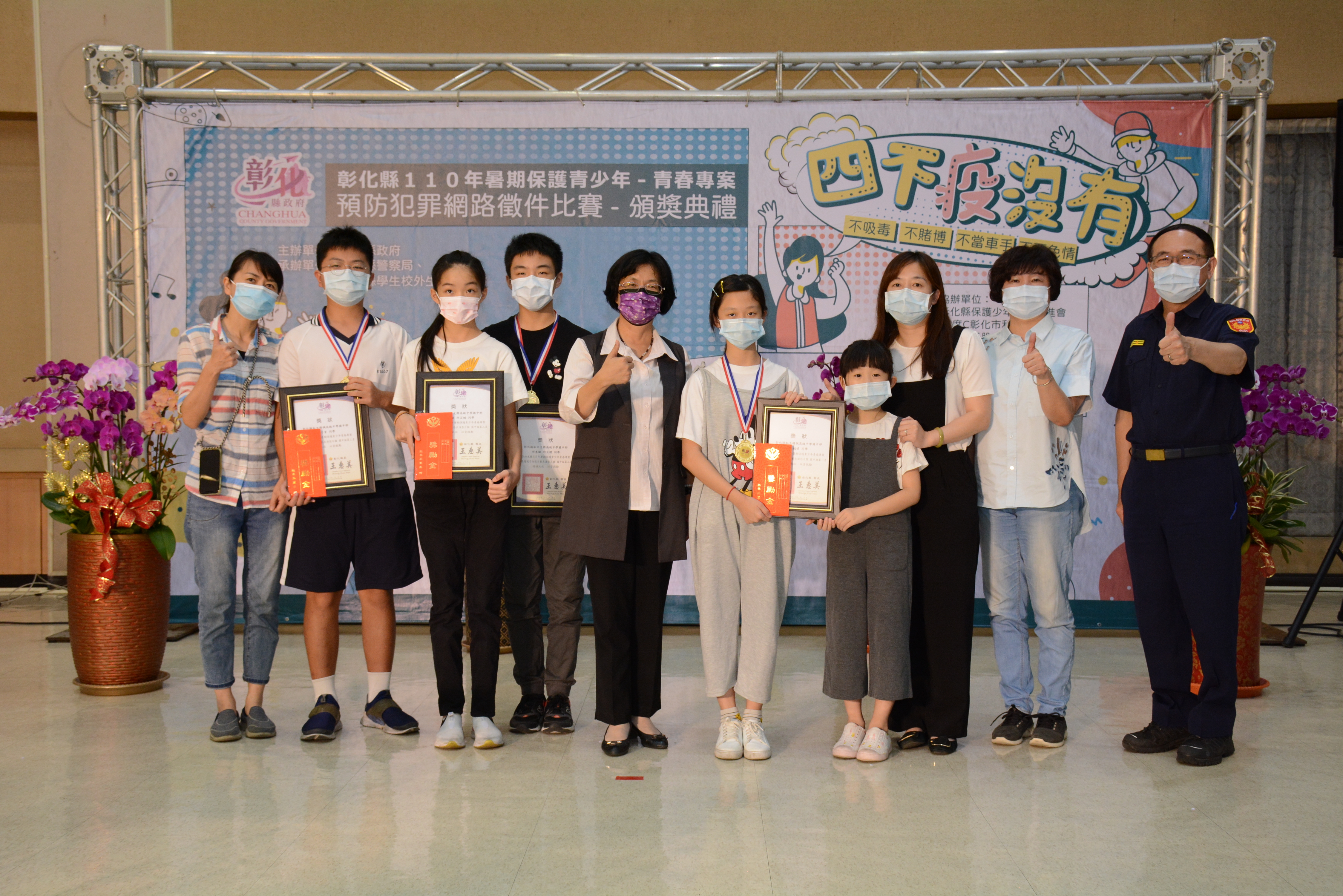 彰化縣警察局與彰化縣學生校外生活輔導會共同在暑假期間舉辦110年保護青少年-青春專案「四不”疫”沒有」創意徵件比賽,有望吸引國高中生各路高手展現創意,委由專家評審團的嚴格篩選後,分別有國、高中(職)組1-4名及佳作勝出,除了頒發得獎學生獎金、獎狀外,並在直播中做一個具體的成果展示,本活動獎金非常優渥(最高獎金1萬元禮券),且在彰化縣保護少年婦幼協進會大力支持下,增加「徵件期間」及「直播活動」按讚、標註2位好友、留言加分享抽獎活動(獎品有IPHON12手機、平板電腦等168個獎項),至今已吸引了4,660則留言、4,724個分享及3萬7,494個瀏覽人數,反應非常熱烈,有效提供了青少年及學生們在暑假期間非常好的休閒活動,在家防疫創作拿獎金,觀看直播拿獎品,一舉數得。本活動由王縣長惠美親自在直播中公布決賽得獎名單並頒(抽)獎,縣長也勉勵在場的學生將來可以編織更完美的創意夢想,共同締造彰化縣的創意美好藍圖。