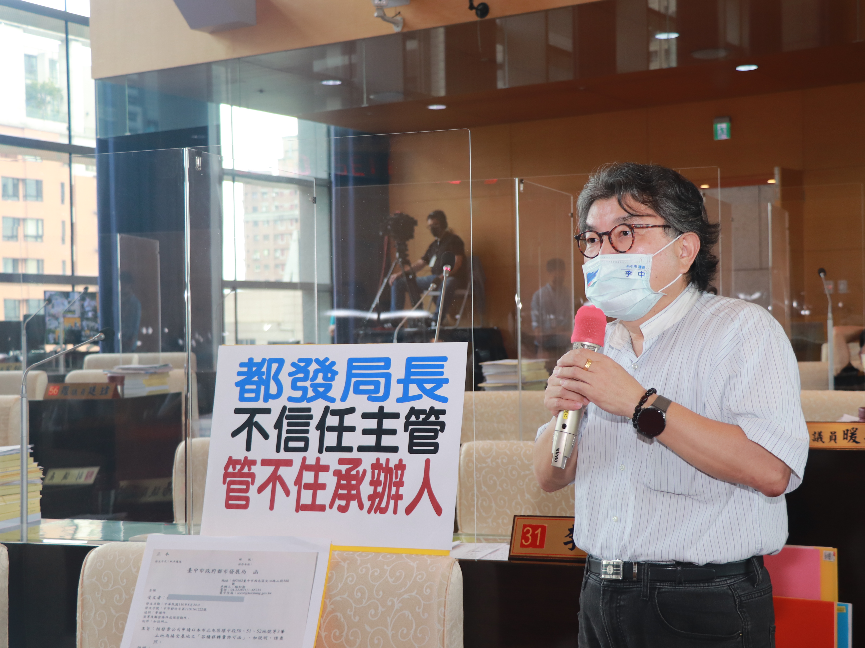 李議員指出,都發局黃局長經常不親自主持會議,卻於委員會議結束承辦人員上陳會議記錄時,擅自增加許多增加植栽或增加建築物棟距的意見,這讓整個審查流程需反覆進行、曠日廢時,且此樣態已多次發生,李中形容都發局長是既不相信主管,又壓不住承辦人員,已引發相當的民怨。