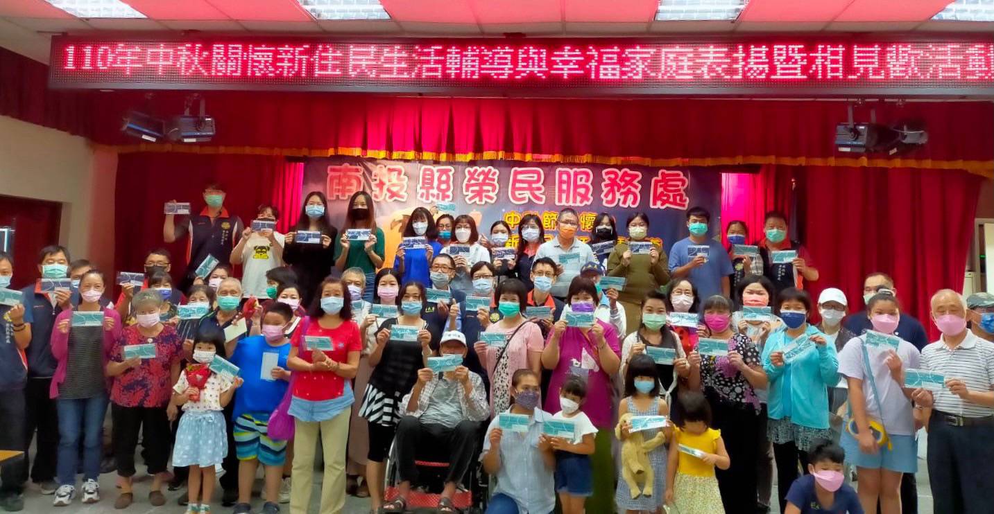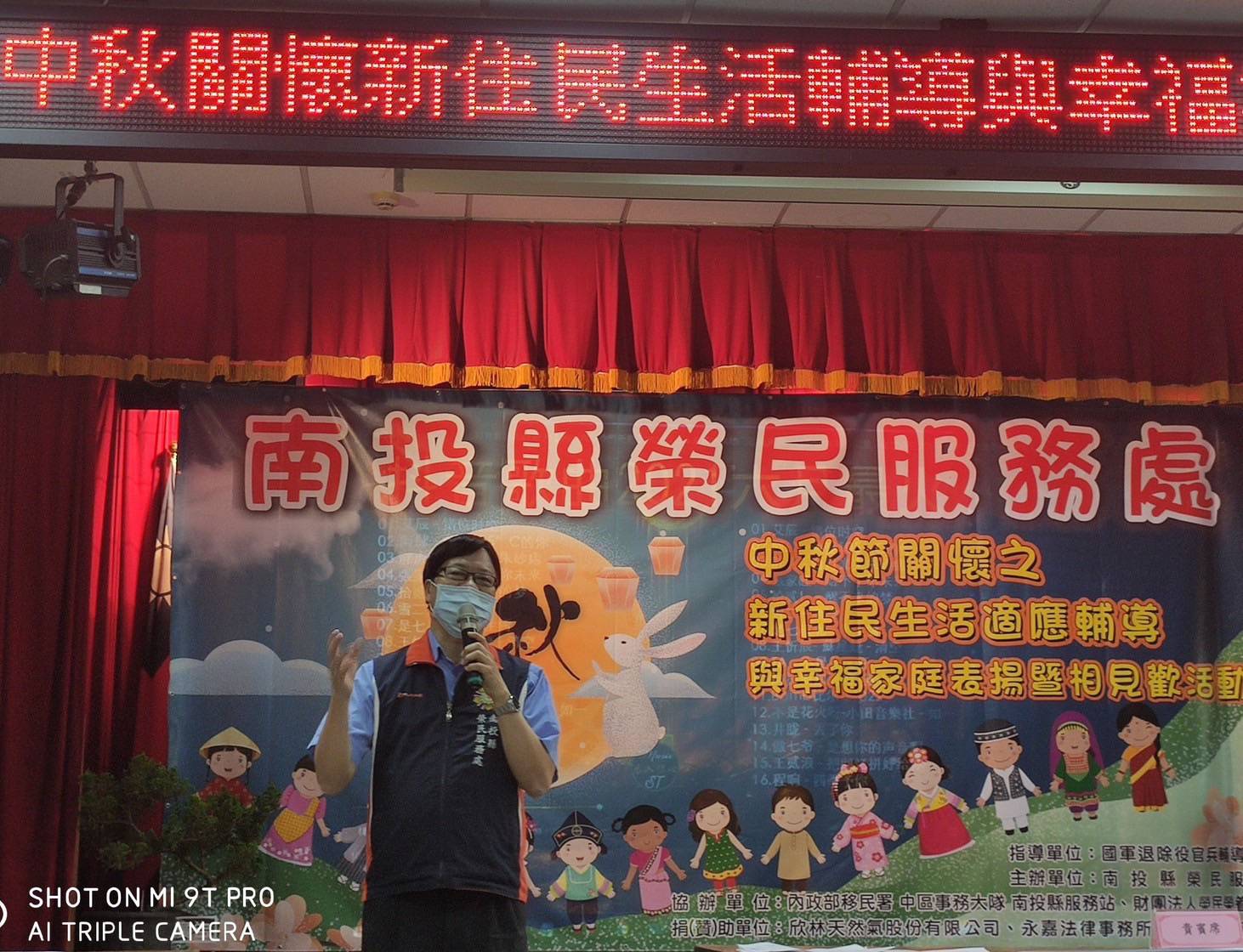 南投縣榮民服務處,為加強關懷服務退除役官兵(眷)、榮民失怙學子及新住民生活適應,使他們在疫情期間仍能感受秋節氣氛與社會關懷,並勉勵失怙學子勤奮向學,懷抱感恩之心,溫馨平安過好節。於今日在該處大禮堂辦理「中秋關懷之新住民生活適應輔導與幸福家庭表揚暨相見歡活動」,該處邀請了新住民家庭、退除役官兵、遺眷、內政部移民署中區事務大隊南投縣服務站蔡崇富主任以及長期支持,認養榮民遺孤的認養單位代表及認養人包括有欣林天然氣公司楊正南副總經理;台中榮總埔里分院社工室張裕郎主任、趙建中將軍等人,而南投市宋懷琳市長也特別到場致意。
