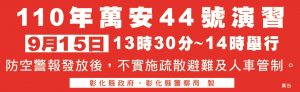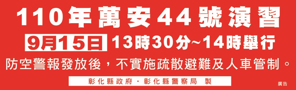 彰化縣「110年軍民聯合防空(萬安44號)演習」訂於110年9月15日(星期三)13時30分至14時舉行,並結合國軍漢光演習,全國各縣市同步演練,考量我國仍處防疫期間,及遵循「中央流行疫情指揮中心」防疫指導,因此本次演習僅發放「防空警報」及「空中威脅告警系統手機簡訊」,不實施人、車管制及疏散避難演練,以避免群聚,請縣民多加留意及配合,另為讓縣民能掌握住家附近防空疏散避難設施位置及狀況,本縣已於「彰化縣警察局資訊網」及「彰警OnlineAPP」建置「防空疏散避難專區」提供民眾查詢,請多加利用。