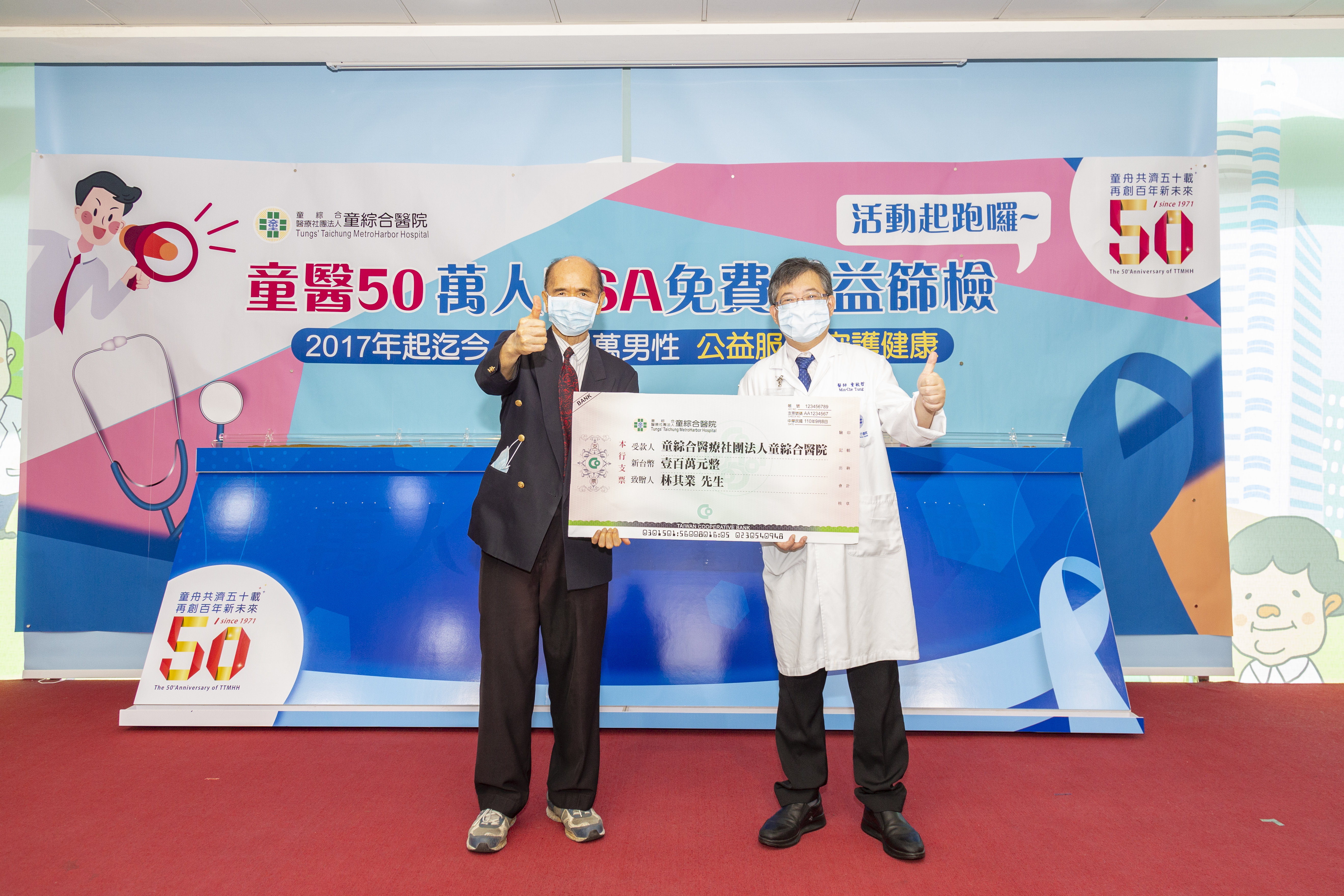 中華民國泌尿腫瘤關懷協會常務理事林其業先生,繼去年捐贈一百萬響應篩檢活動後,今年仍是捐贈一百萬繼續支持,希望能夠幫助更多男性民眾。林其業先生本身也是病友,在2012年,突然發現攝護腺指數(PSA)高達69,已經是標準值4的17倍,屬於癌症末期,尋求三家大醫院的治療,但醫師多是認為癌症末期,不願意為開刀,最後找到了歐宴泉院長,歐院長使用達文西微創手術來清除腫瘤細胞,術後迄今已十年,林其業先生仍身體狀況十分良好,所以更深切感受到定期篩檢的重要性,為了幫助更多男性朋友都能儘早發現早期治療,也特地連續兩年各捐贈一百萬元,支持舉辦萬人PSA公益篩檢活動,讓更多人也可以受惠。