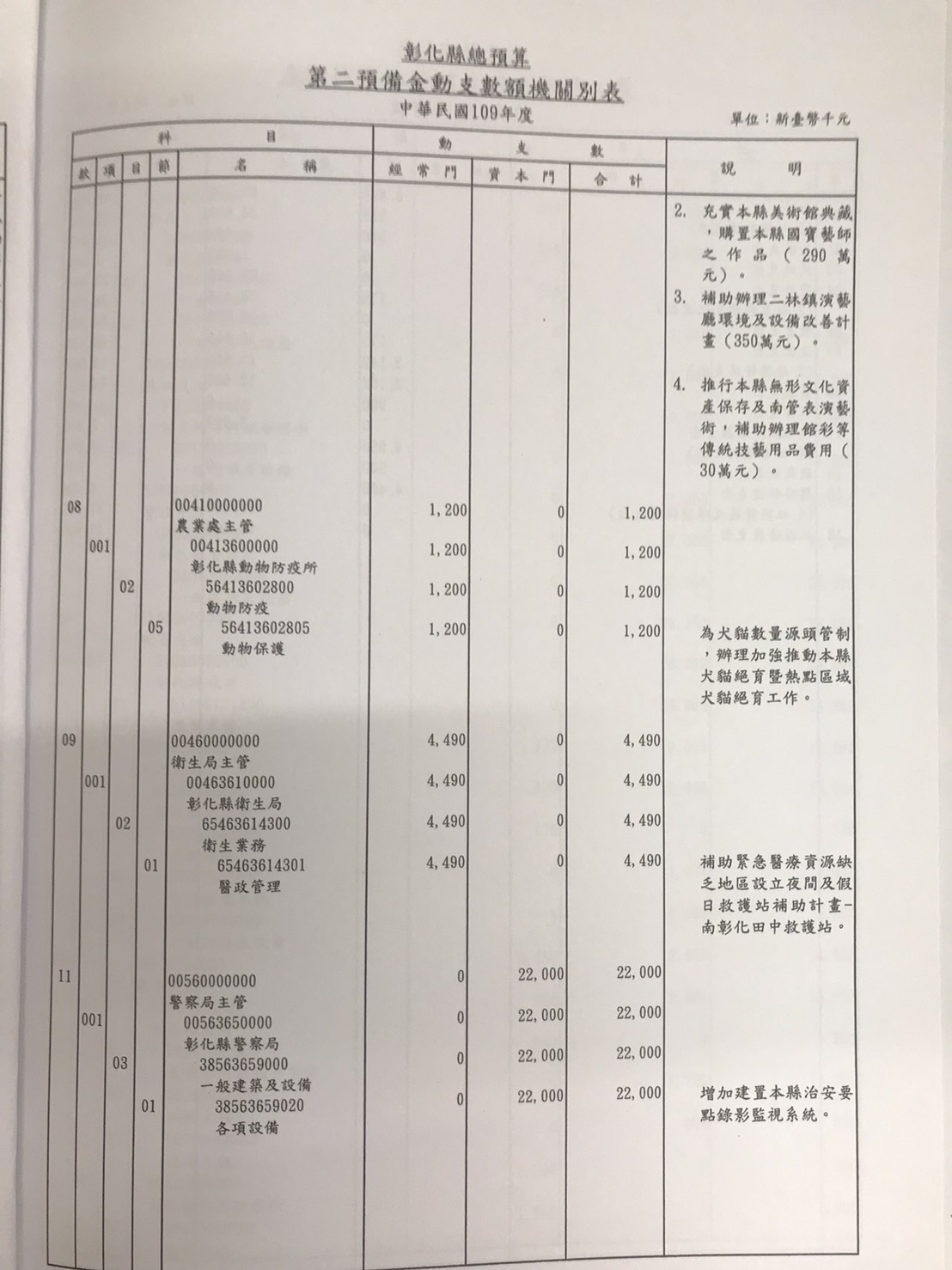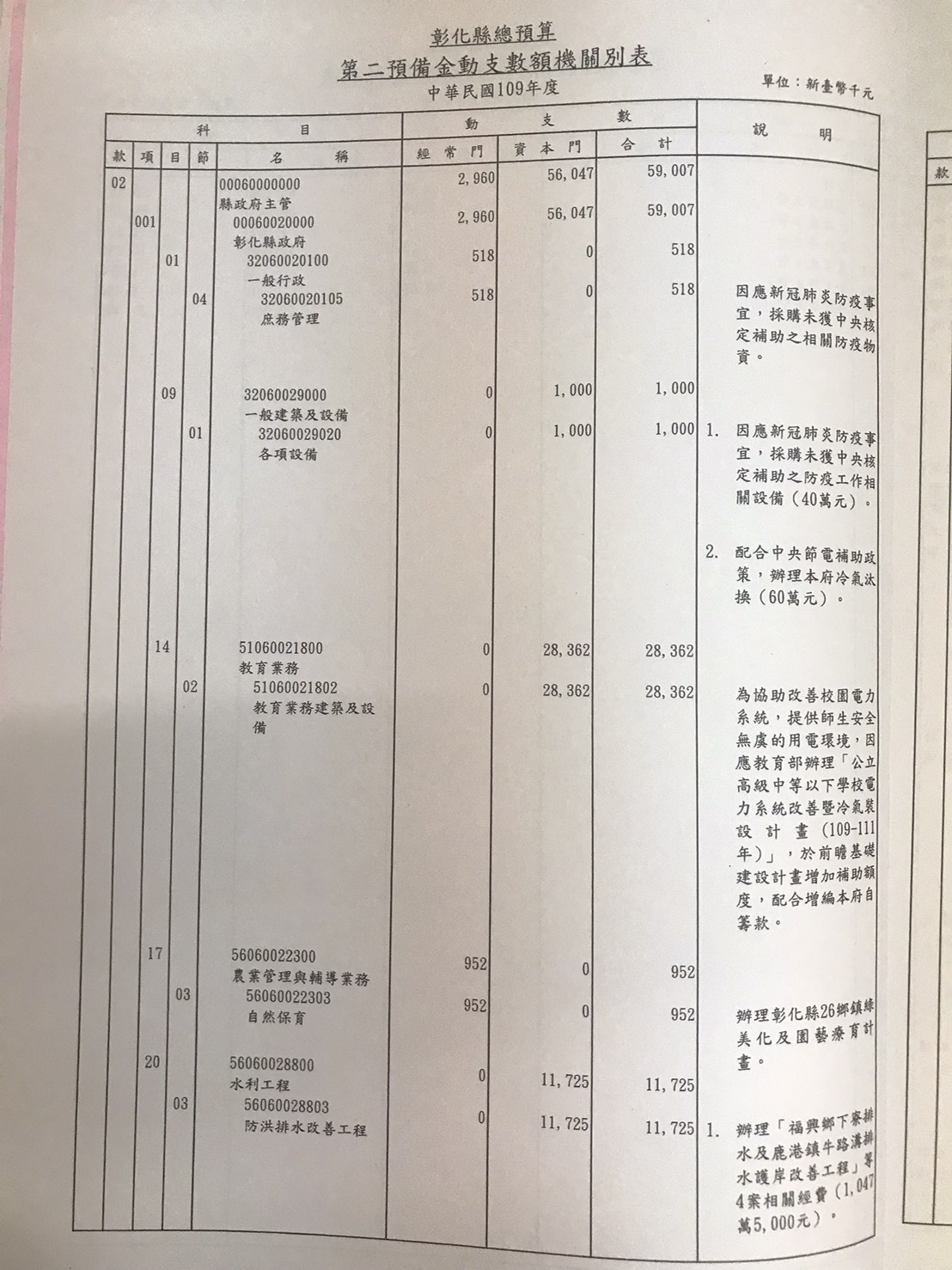 縣議會黨團總召許書維表示,根據預算法第70條規定,各機關於年度進行中遇有一、原列計畫費用因事實需要奉准修訂致原列經費不敷時;二、原列計畫費用因增加業務量致增加經費時;三、因應政事臨時需要必須增加計畫及經費時,得經核准動支第二預備金。翻開縣府109年度彰化縣總預算第二預備金動支數額表,有縣府冷氣汰換、本縣各戶政事務所汰換各項老舊設備、彰化縣立圖書館汰換戶外全彩電視牆設備等申請動支救命錢,各機關不是應該將所主管範圍內施政計畫,擬定歲入歲出預算。