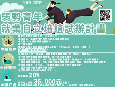 因應疫情影響,減輕職場新鮮人的經濟壓力,台中市政府社會局鼓勵弱勢青年累積資產,針對今年應屆畢業低收入戶、中低收入戶青年,只要穩定就業、開戶儲蓄,加碼相對提撥存款20%,試辦期間從10月至12月,為期3個月,最高補助6,000元,9月15日起將開放意願調查,名額75位,額滿為止。