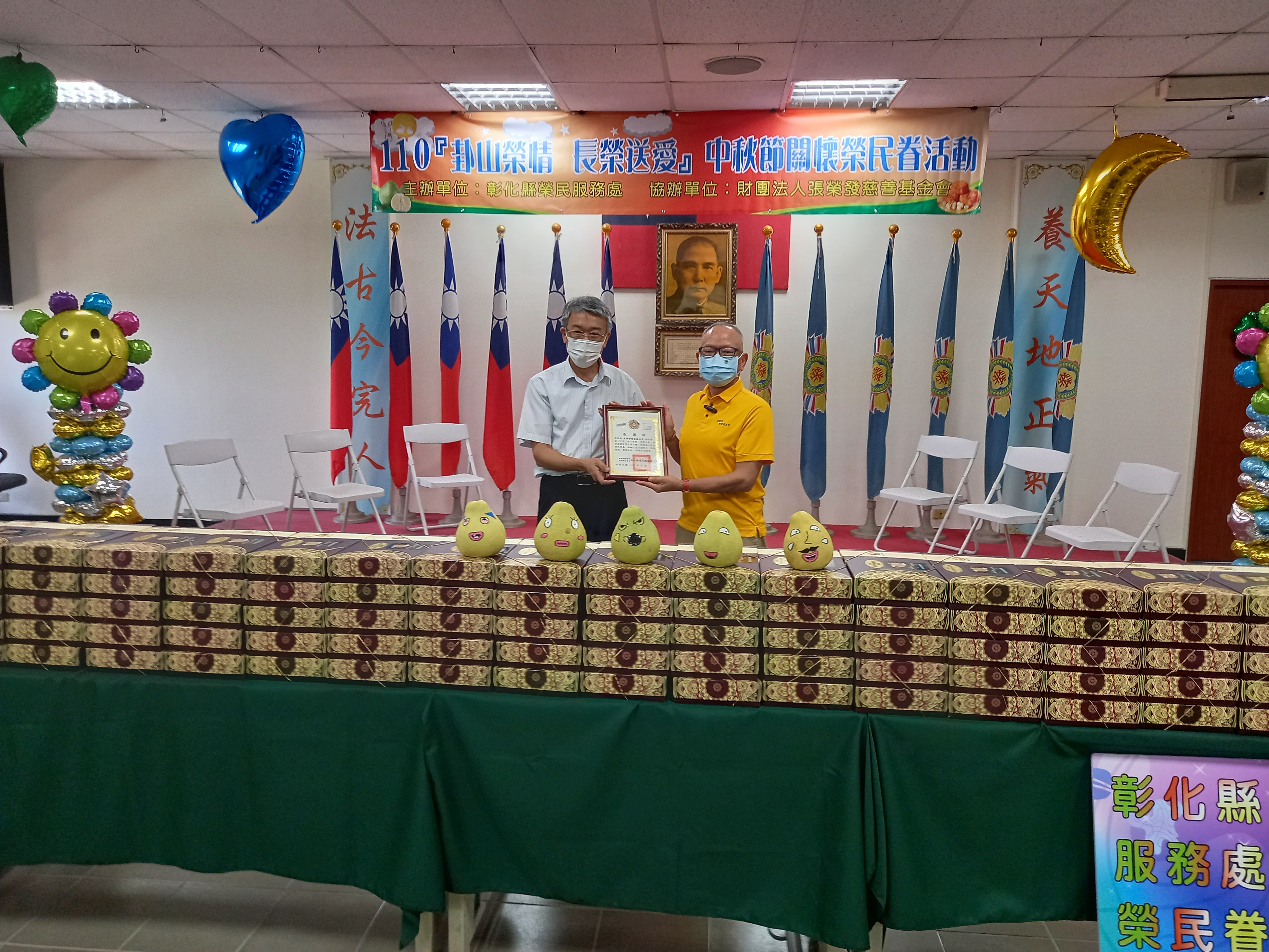 彰化縣榮服處於今(15)日舉辦「卦山榮情,長榮送愛」中秋關懷榮民眷活動,特連結財團法人張榮發慈善基金會,基金會深具公信力,投身公益不落人後,捐贈鹿港百年老店餅舖所製作的月餅禮盒,讓轄區特較需榮民(眷)品嚐百年糕餅店的傳統月餅好滋味。