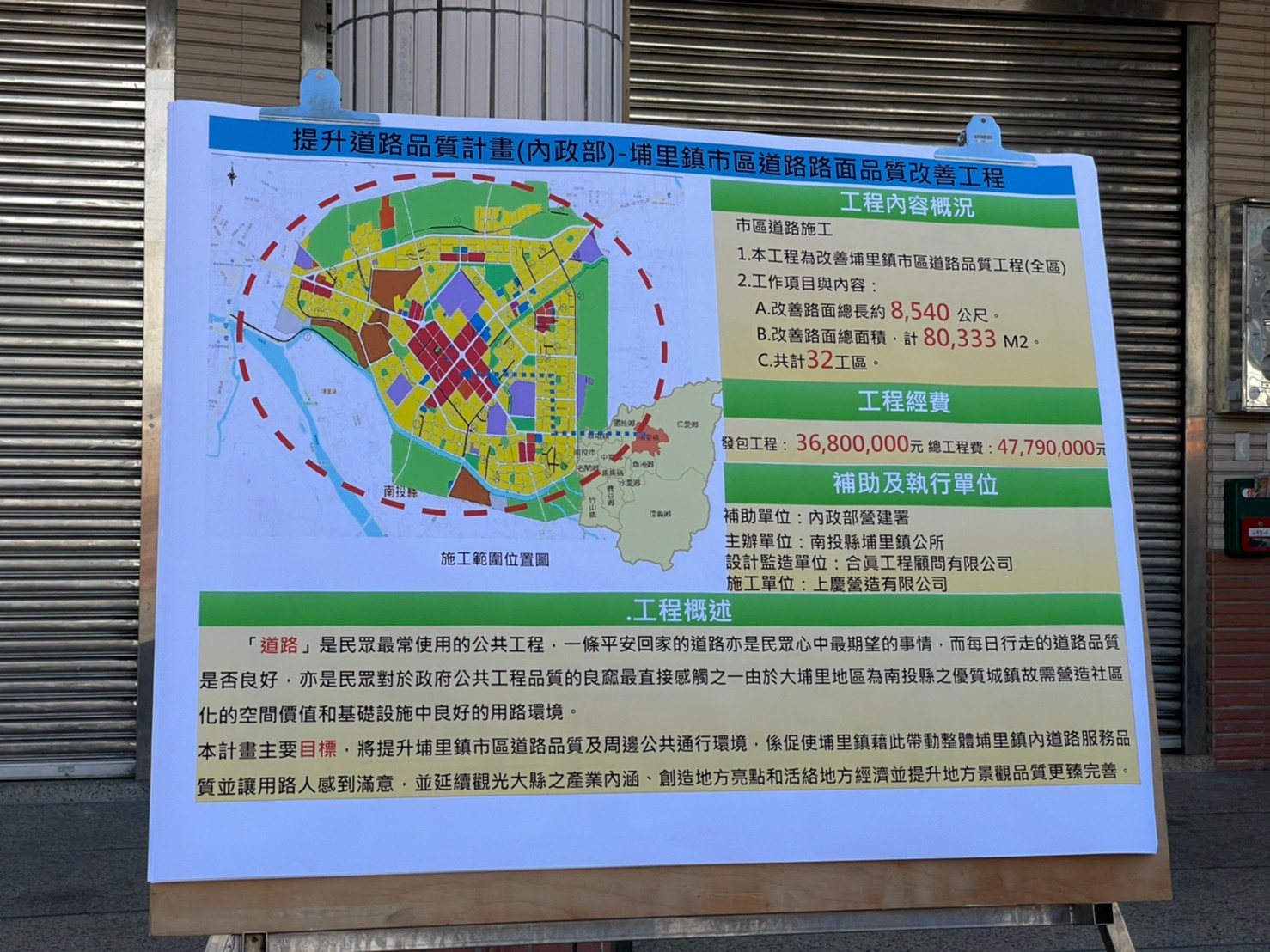 埔里鎮前瞻基礎建設計畫-提升道路品質計畫1.0第六階案,該工程係由公所109年提案經縣府至內政部營建署,大埔里地區為南投縣之優質城鎮,需營造社區優化的空間價值和基礎設施中良好的用路環境,鎮公所透過一系列之提升道路品質計畫,要將埔里鎮市區道路品質及周邊公共通行環境改善,除108年已執行完成提升道路品質計畫1.0第五階計畫,有效改善市區中山路二段(公所前)及中山路三段(酒廠前)主要道路,促使提升整體鎮內道路服務品質並讓用路人感到滿意,再主動積極接續提報計畫,透過蔡執行長協調中央政府爭取本案之工程,總核定經費為4,779萬元(公所負擔配合款860萬元),本案工程計畫施工範圍於市區包括南安路、育溪路、南興街……及和平東路等共計32條老舊道路,總長約 8.54 公里,總面積約 80,333 平方公尺,工程於110年8月9日開工,截至110年9月22日止,工程進度已達52%,已完成26條道路刨鋪,預計今年11月初完工。