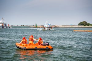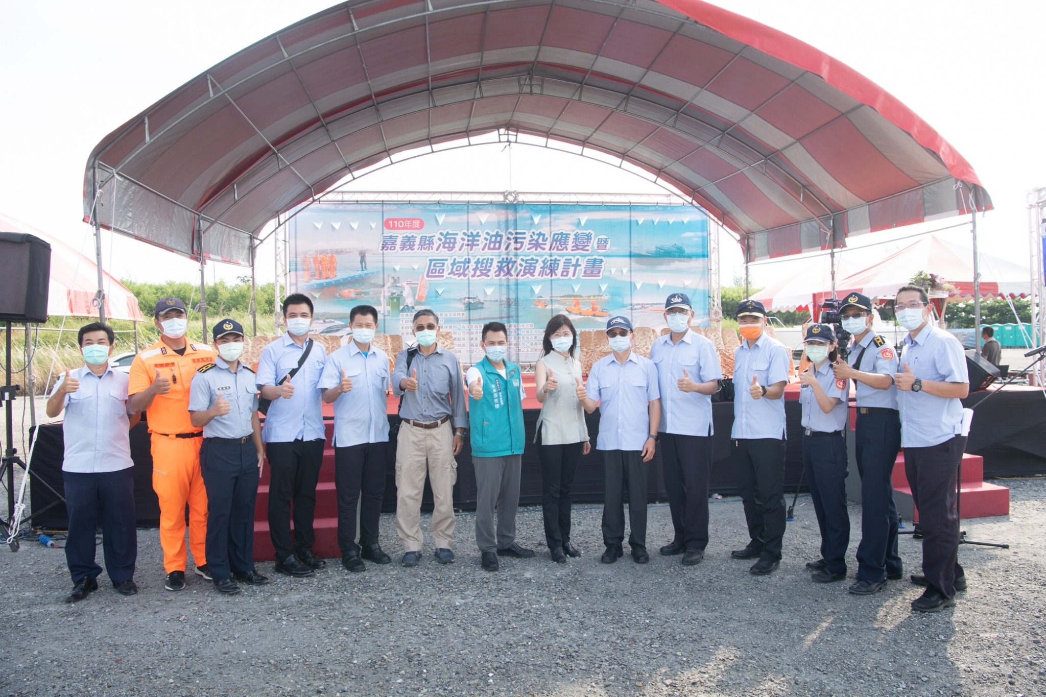 海巡署中部分署第四岸巡隊協同嘉義縣政府、海洋委員會海保署、海巡署艦隊分署第十三海巡隊及嘉義縣救難協會等14個公部門及民間團體於昨日下午1點,在台灣公主布袋國際遊艇港辦理「110年度嘉義縣海洋油污染應變暨區域搜救演練」,現場由翁章梁縣長親臨主持,並由海保署宋欣真副署長、海巡署中部分署張忠龍分署長等機關長官到場視察及指導,本次演練總計派遣4艇次、11車次及70人次,藉以提升各機關及團體狀況處置默契及展現救援能量。