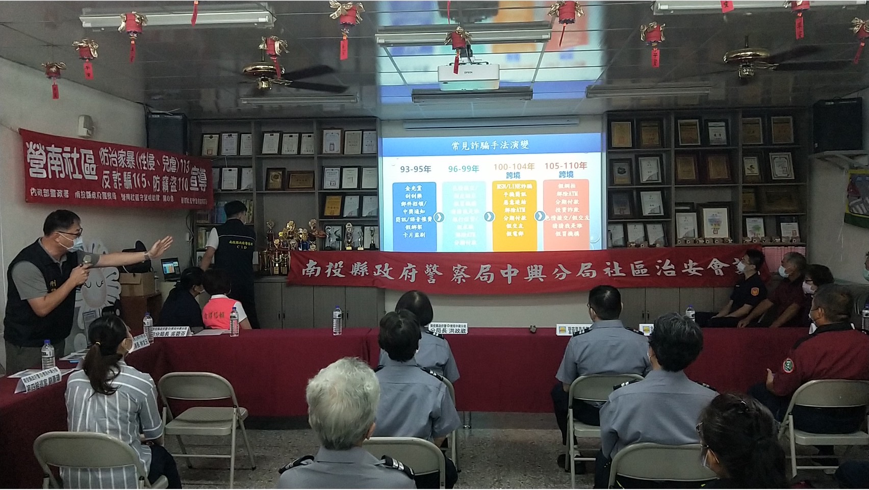 南投縣中興分局邀請縣議員賴燕雪、市民代表王明洲、蔡玉英、營南里長蔡育民、營南守望相助隊及在地里民參與本項治安會議,此次中興分局針對預防詐欺犯罪、安居緝毒、交通、婦幼安全等議題製作簡報,而且內容一改過去教條式法治觀念宣導,而是事先了解參加民眾年齡較為高齡,所以編撰與會人士聽得懂、看得懂,輕鬆活發互動方式,成功宣導當前警察重點工作及民眾關心詐欺、交通及婦幼等之議題;本次治安會議在非假日午後舉辦,參加社區民眾相當踴躍,成功搭起社區警政友善網絡、強化社區治安營造力、積極回應民眾需求,表示警察維護治安的決心。