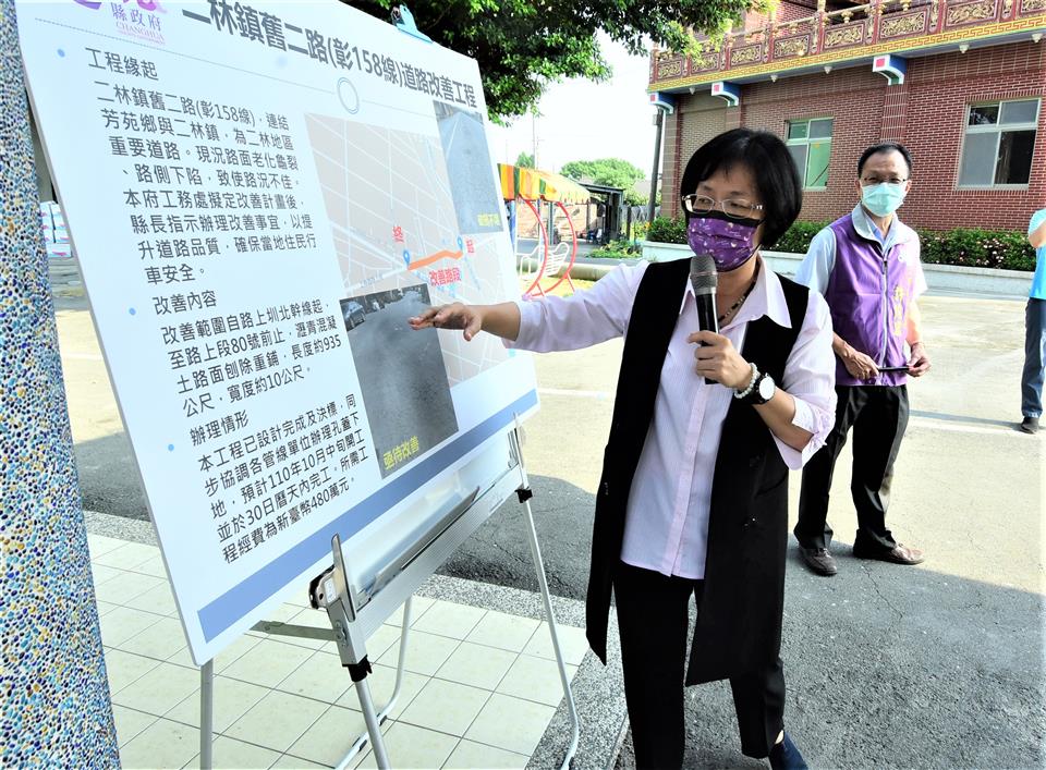 王縣長表示,除了來視察二林的道路不平以外,在舊二路附近也看到舊社代安宮不惜巨資,地方環境整理的水噹噹。舊二路(彰158線)工程改善範圍自路上圳北幹線起,至路上段80號,長度約935 公尺,寬度約10公尺,所需工程經費為新臺幣480萬元。目前也在進行管線的整合,與台水、瓦斯、台電及中華電信溝通,將人孔蓋趕快下地,如果有在蓋房子的請盡速申請管線,人孔蓋下地後,路面將維持2年不挖。