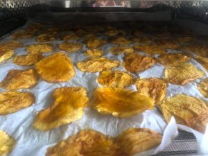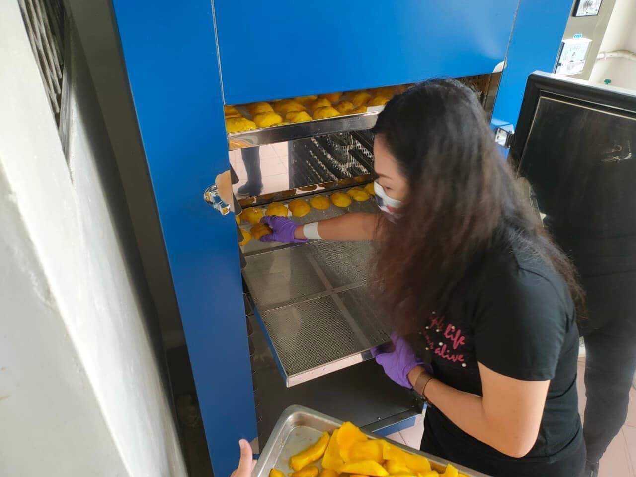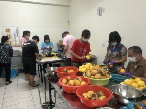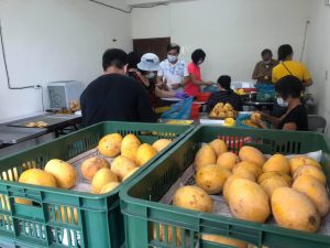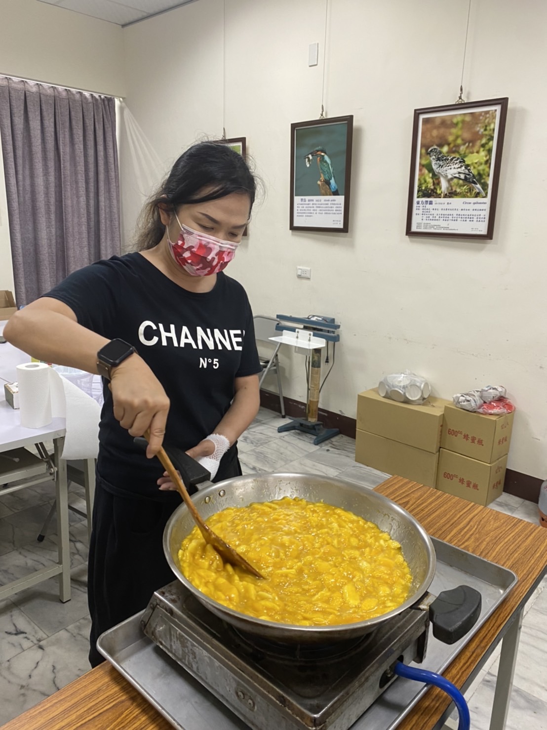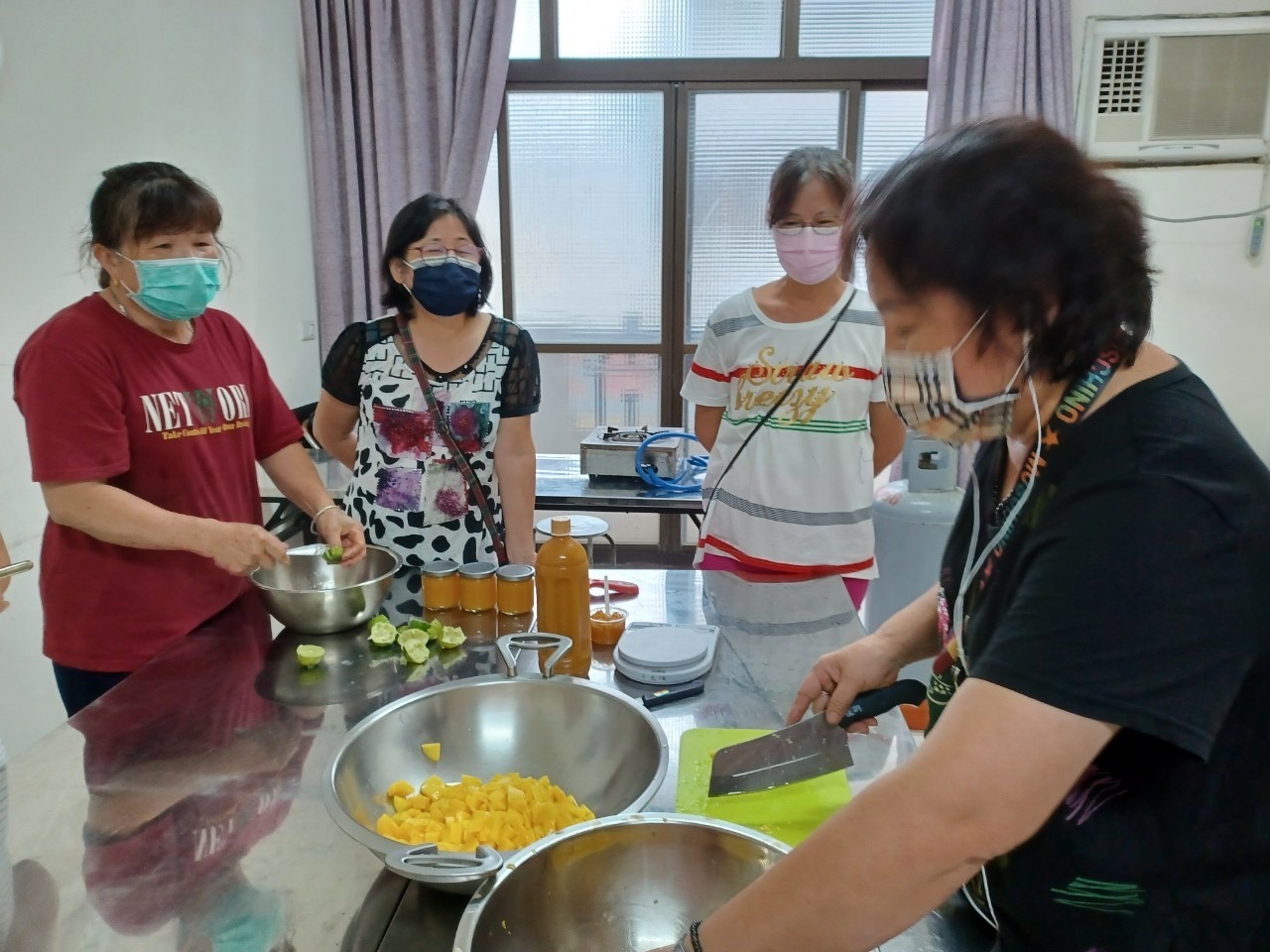 彰化湖埔社大學員,近期偕同在埔心鄉種植大量黃金芒果的李文男理事長來辦公室研討,社大思考著如何結合東螺禾作知識平台來協助果農們,當初疫情需要口罩,口罩有國家隊,那我們就來成立果農支援隊,這樣構想在腦海中盤旋,因為眼見果農採收芒果後,一簍簍賣不出去只能往田裡倒,真的很浪費,故湖埔社大資源運用社,找了創意料理王老師與志工隊美英總幹事討論,王老師建議作成系列產品,可以由目前志工隊人力支援,就這樣在疫情下停課教室搖身一變變成工廠,志工隊成員轉身一變,變成果農的「支援隊」,開始幫小農生產「金蜜芒果乾」,經過老師不斷試驗過程,烘焙時間高達36小時不間斷,從60度轉化40度透過不斷翻面,嘗試不同溫度轉換低溫烘培,10斤鮮果烘培成一斤,終於果乾吃起來跟外面產品不一樣 , 志工喜悅地分享著,從志工們細心的整理果肉,1顆芒果只留下2片製成果乾,其餘2邊加肉加入檸檬用小火不斷攪拌,歷經5小時才能製成果醬,我們的果乾Q彈不黏牙,果醬吃出扎實果肉而不膩,果皮及果核分享給小農養鴨養雞剩餘作成酵素回歸農田,完全食物在黃金芒果身上運用無虞,社大志工農民支援隊支援果農長達1個月的時間,產出千包芒果乾及果醬,在疫情下農民得於解憂。