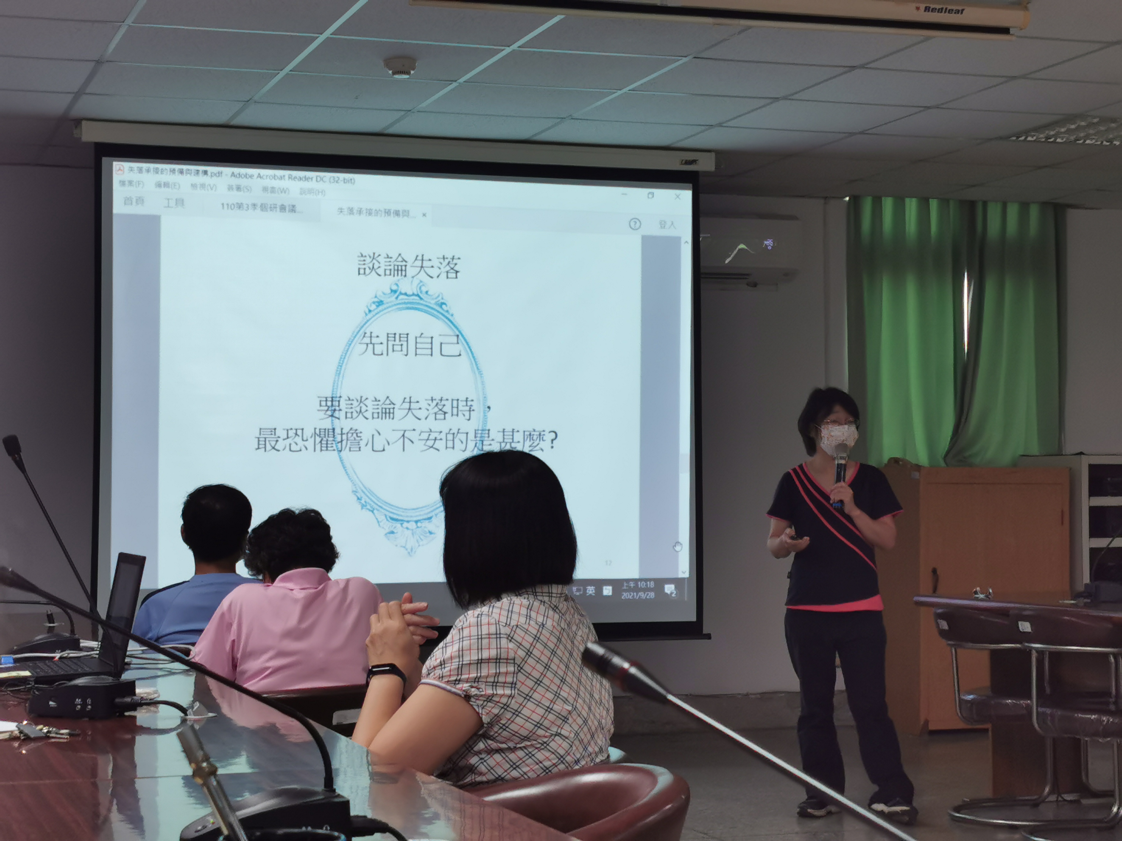 彰化榮家為了提升照顧品質,日前舉辦110年第3季個案研討會暨教育訓練,邀請社團法人中華民國耶底底亞家庭關顧協會秘書長曾孆瑾講師蒞臨指導,讓同仁了解每個老化階段中需面對的課題,在面對住民失落情緒時,態度更加坦然不再恐懼