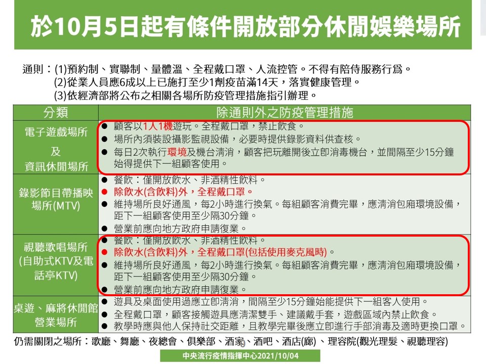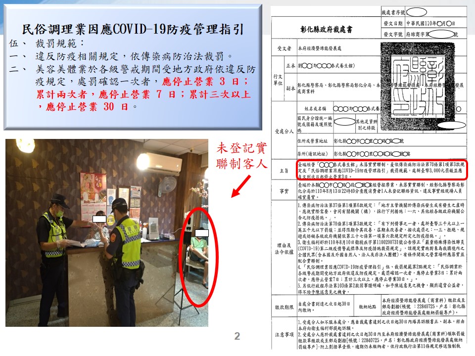 醫療應變組副組長羅一鈞表示,「這一波開放的休閒娛樂場所,有開放飲食的是桌遊、麻將場所,那有開放飲水和飲料的是KTV、MTV,限非酒精性的飲料,那電子遊戲場跟資訊休閒場目前還是以禁止飲食為原則 。」本次臨檢勤務也發現在電子遊戲場內仍有顧客飲食 ,另外在自助式KTV內客人自行購買酒精性飲料飲食情形1件 ,無視於防疫指引,彰化分局長表示,彰警均蒐證後連同照片及影片函請彰化縣政府裁罰 。
