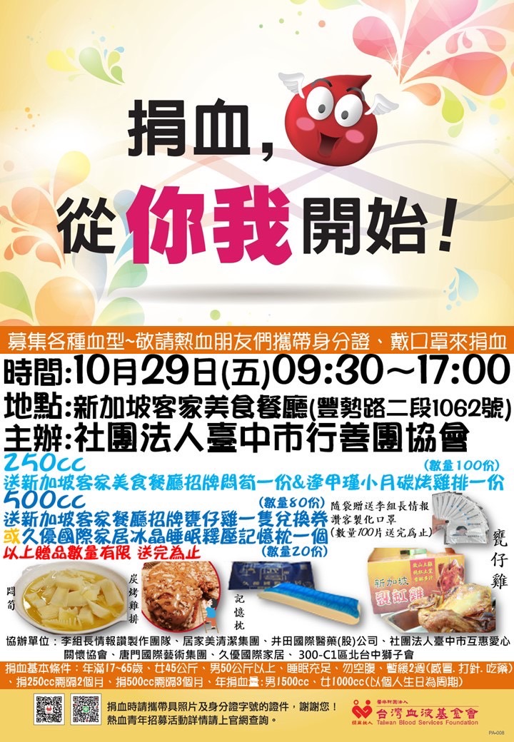地方新聞臺中市老饕有福囉! 捐血送甕仔雞兌換券 榕嫻4 年 ago4 年 ago01 mins 【環衛新聞記者鄭榕嫻報導】 疫情漸緩,血庫告急! 邀請熱血的你一起挽袖捐血,此次活動贈送皆有限量,期盼此次活動能為血庫盡一份心意。 捐贈250cc贈送新加坡客家美食餐廳招牌燜筍1份(數量100份)+逢甲瑾小月碳烤雞排1份(數量100份)、捐贈500cc贈送新加坡客家美食餐廳招牌甕仔雞1隻(數量80隻)兌換券或久優國際家居冰晶睡眠釋壓記憶枕1顆(數量20顆)。 文章導覽 Previous: 臺中港實施港區災害防救、港口設施保全、防疫聯合實兵演習Next: 第二警分局辦理守望相助隊常訓 發佈留言 取消回覆發佈留言必須填寫的電子郵件地址不會公開。 必填欄位標示為 *留言 * 顯示名稱 * 電子郵件地址 * 個人網站網址 在瀏覽器中儲存顯示名稱、電子郵件地址及個人網站網址,以供下次發佈留言時使用。