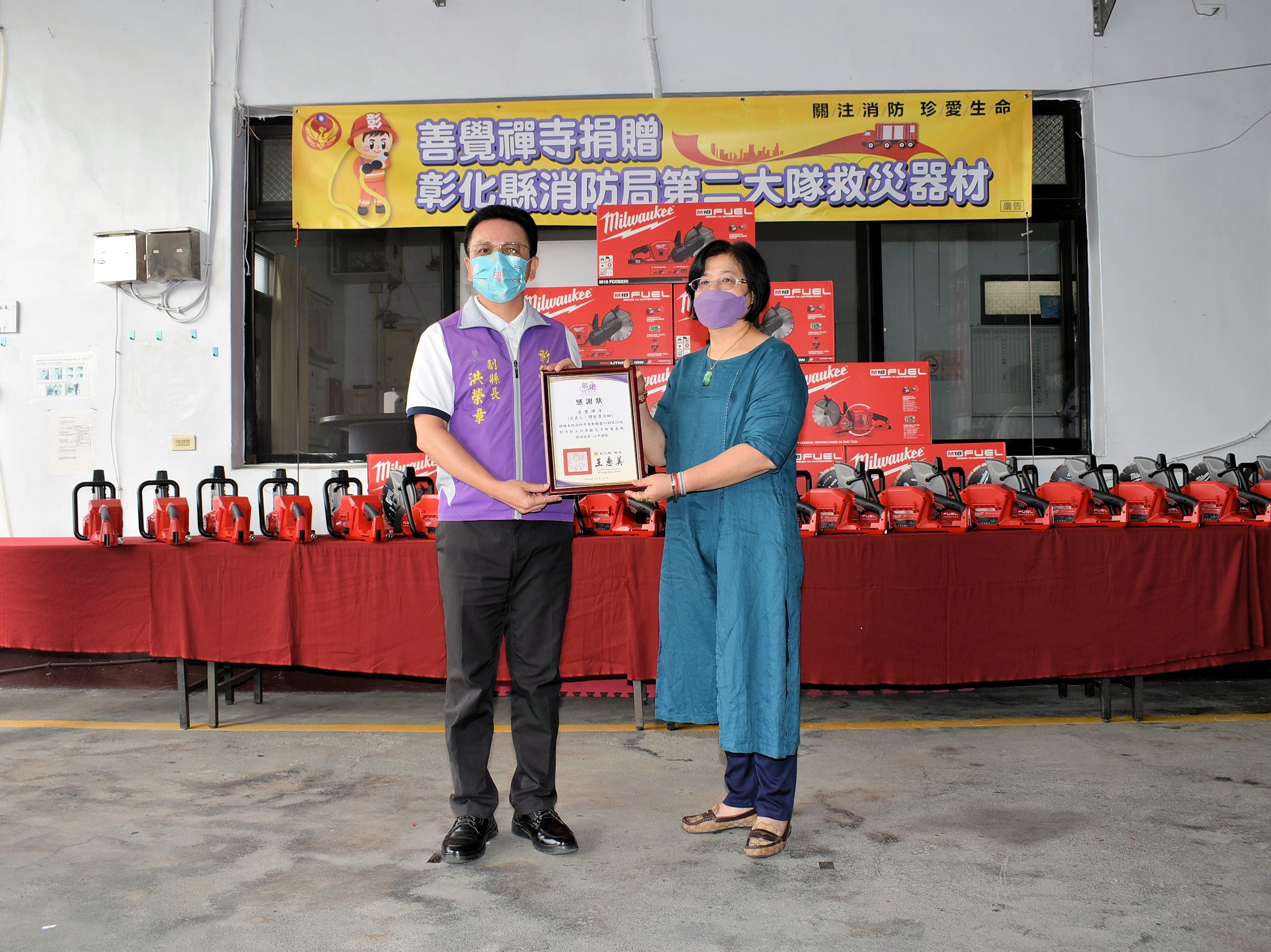 近期發的國內火警造成死亡嚴重!善覺禪寺有感於消防人員救災辛勞及了解救災現場之需求,且體恤消防弟兄的辛勞、減輕消防弟兄們搶救上的負擔,提升救援的效率,於今日捐贈20組電動圓盤切割器(價值新臺幣60萬元)予彰化縣消防局,彰化縣副縣長洪榮章親自出席捐贈典禮,感謝捐贈方對社會公益的付出。