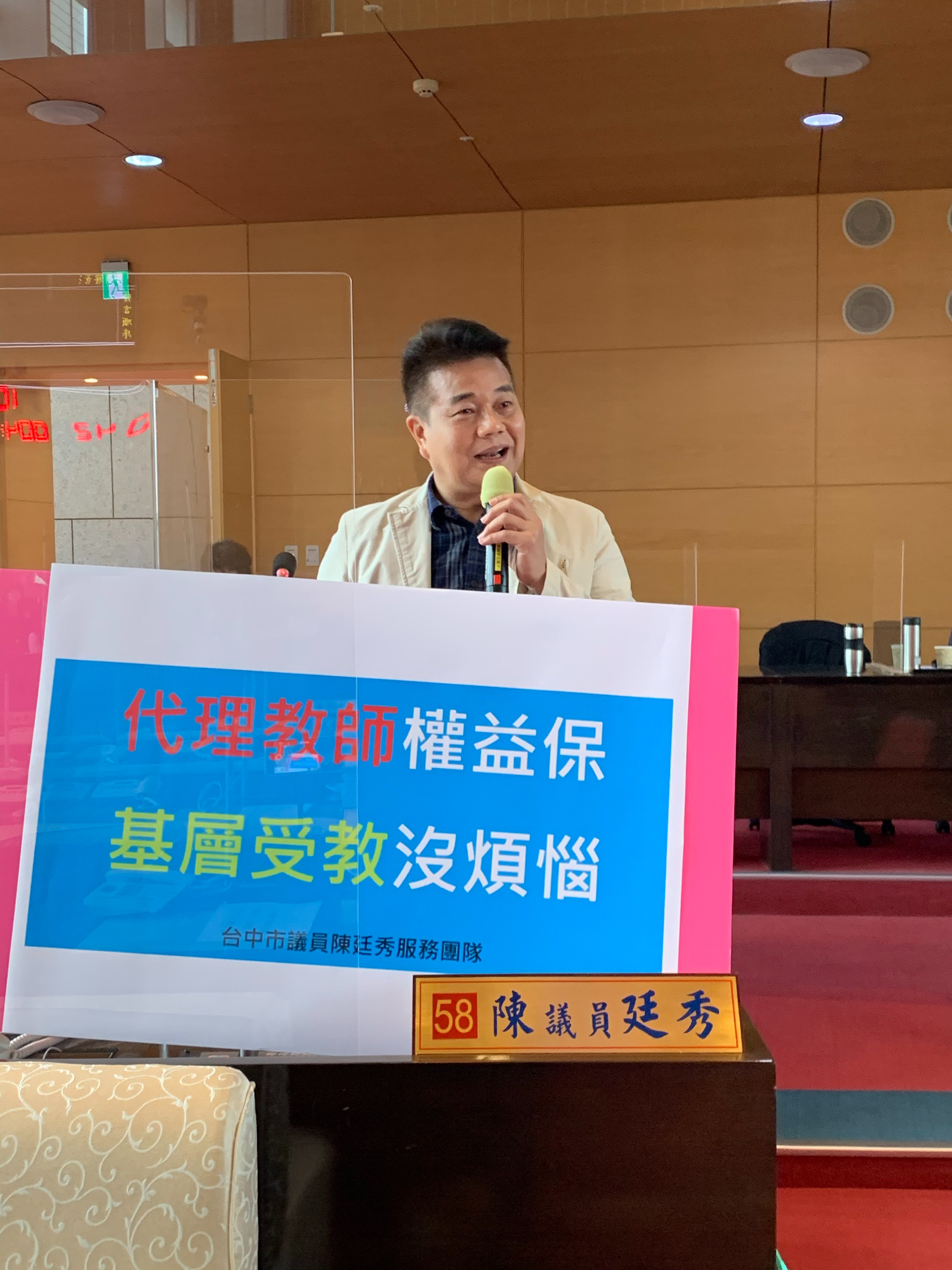 國中小代理教師教學態度不比正式教師差,卻面臨同工不同酬、暑假無償辦公等困境,台中市議員陳廷秀10日在市議會教育文化委員會業務質詢,建議台中市政府應提高教育經費,改善教師待遇,讓代理老師不過勞,學童教育才能更有保障。