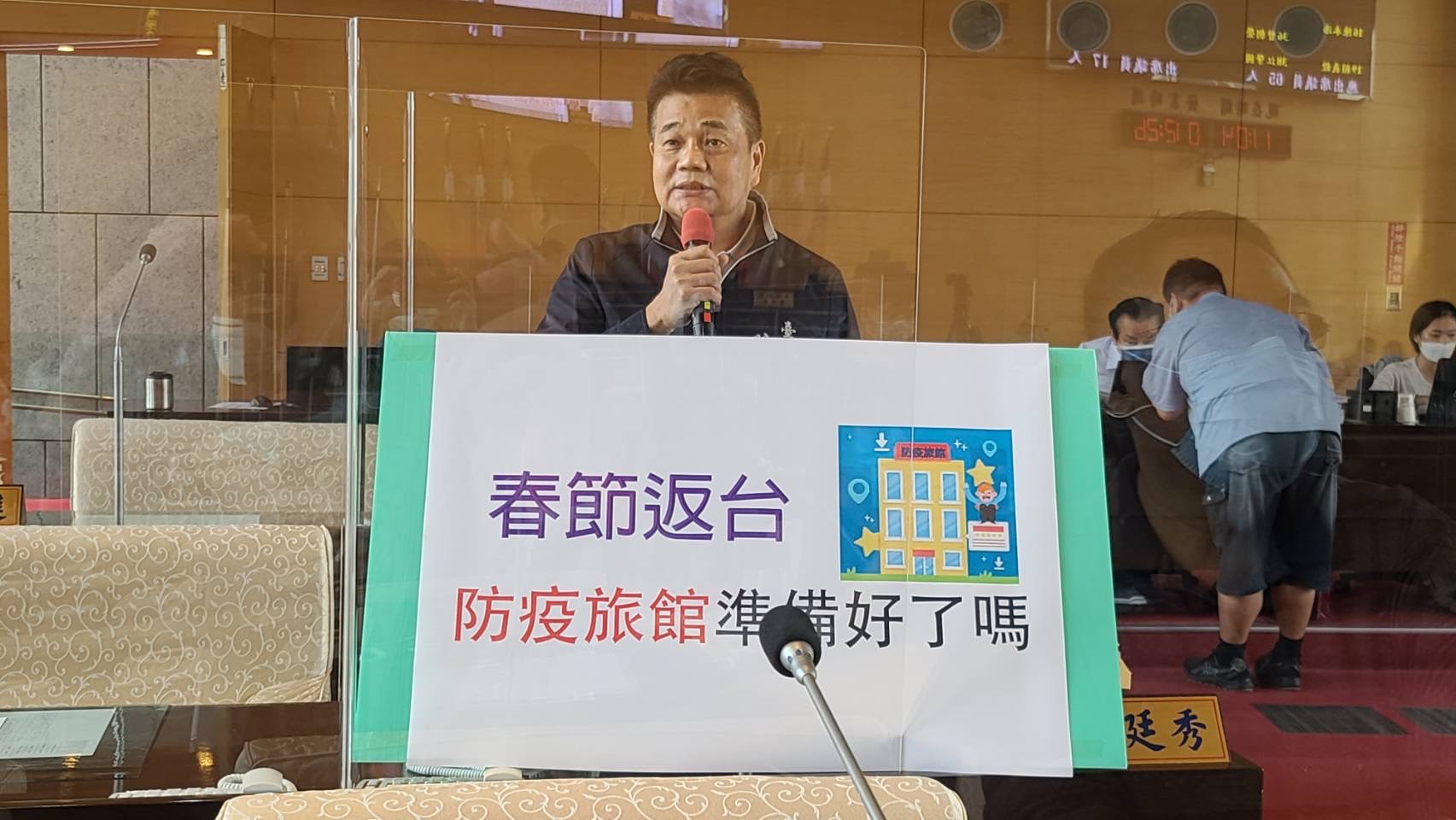 台中市議員陳廷秀15日在議會交通地政業務質詢指出,指揮中心宣布,自12月14日至明年2月14日期間,從國外返國民眾於前10天需要入住防疫旅館或集中檢疫所,期滿篩檢陰性後4天則居家檢疫。但是他近日接到許多想返鄉家人訂不到房的陳情案件,不知道台中市政府觀光局是否知道民眾要回家的這個困擾?為緩解防疫旅館量能吃緊問題,陳廷秀期盼制定政策應更周全,不要一變再變,讓鄉親無所適從。