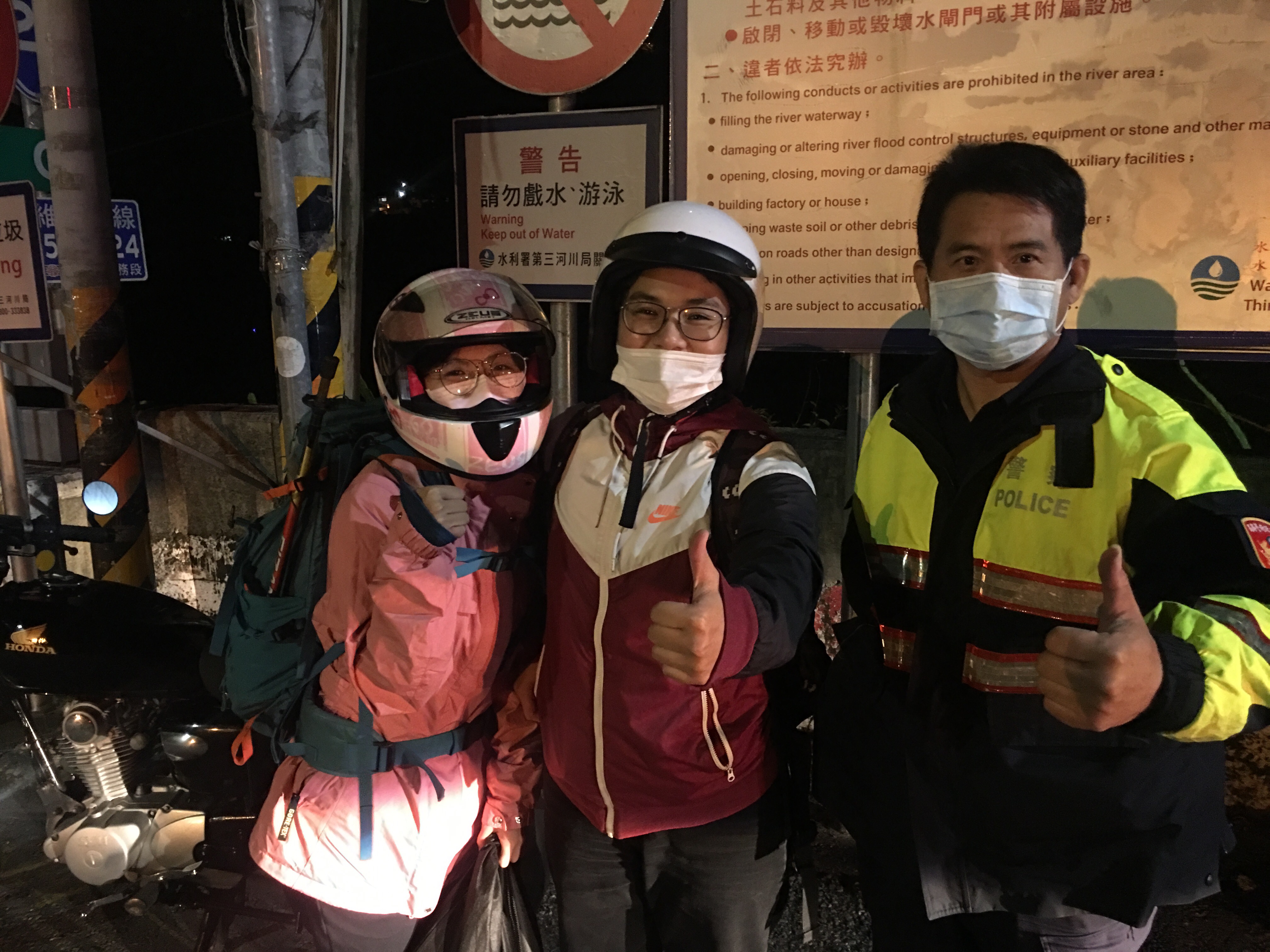因地處偏遠山區,林女及溫姓友人突面對此情況不知該如何是好,因而報警請求協助。茅埔所員警了解後立即至附近加油站,利用塑膠空瓶加了92無鉛汽油,再將汽油帶回給林女的重機車加油,所幸機車終順利發動。員警擔心山區夜間視線不佳,容易迷失方向,協助帶領林女走到東勢區東關路五段的大馬路上,再指引往返回太平區之路線,林、溫二女對於員警熱心之舉,頻頻道謝。