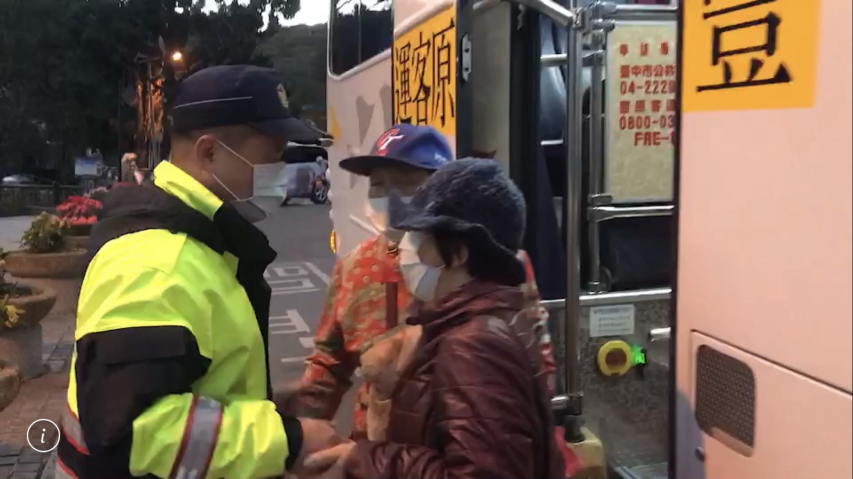 梨山地區夜晚寒冷,只有攝氏8度,暖心員警與阿嬤約定今(21)日一早5時50分,前往慈元宮載著2人前往公車站牌,看著2人順利搭上公車乘坐下山才放心離去,2人受困梨山經員警全力幫忙、妥適安排也滿懷感恩,頻頻向員警致謝。