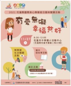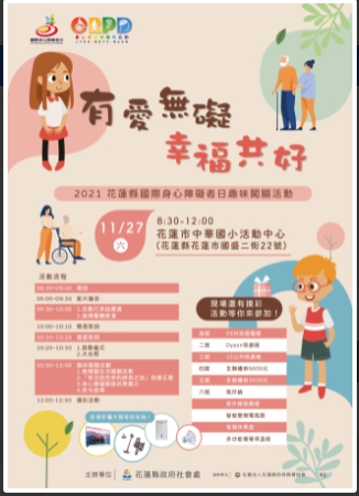 花蓮縣政府結合花蓮縣持修積善協會共同響應每年12月3日聯合國頒訂的「國際身心障礙者日」及落實推動「身心障礙者權利公約」,特辦理「有愛無礙 幸福共好」~趣味闖關活動。