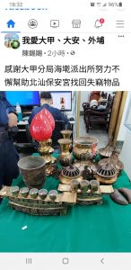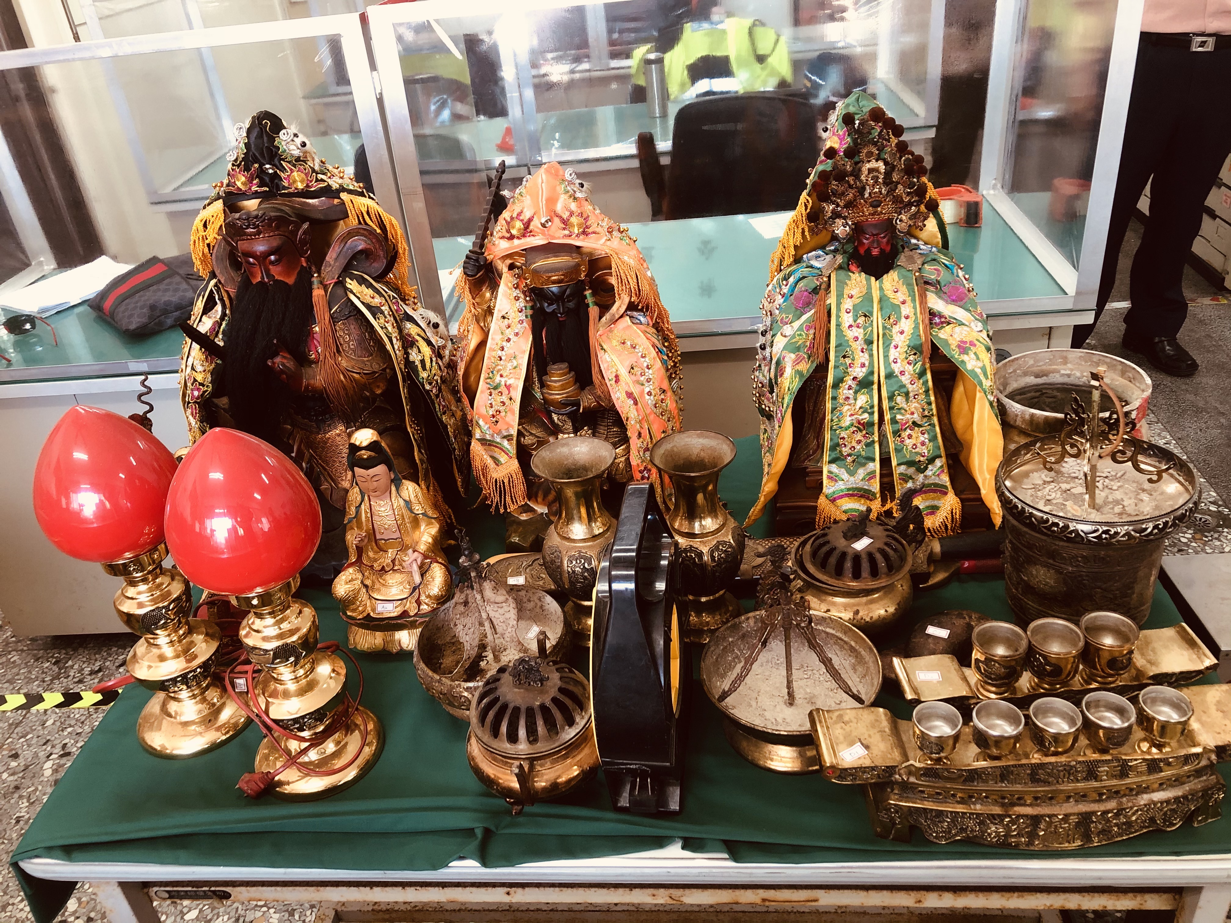 臺中市55歲的卓姓女子,近日覺得家裡不乾淨致諸事不順,日前特別看中「臺中市大安區泰安宮,主祀九天玄女」,今年廟方剛整建完畢,還獲臺中市盧市長、立法院蔡副院長贈匾,在當地頗負盛名,但太大尊了搬不動,才將拜爐偷走,再四處竊取神尊回家供奉,大甲警分局海墘派出所員警獲報後,立即展開追查,調閱監視器鎖定嫌犯,於昨(7)日持搜索票,順利將卓姓等嫌逮捕到案,並於家中取出多件失竊的神像與相關物品,全案依加重竊盜罪移送臺灣臺中地方檢察署偵辦。