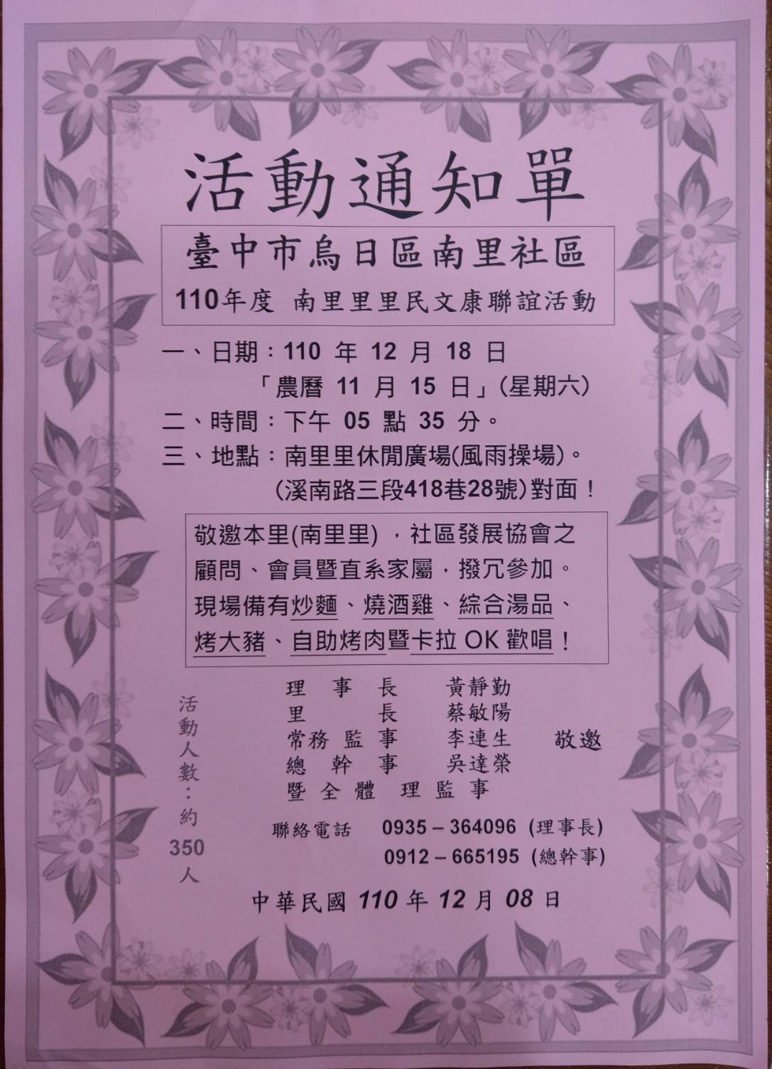 李天生指出,南里里使用焚化爐回饋金,分別於12/06舉辨「風雨運動場啟用典禮」,12/12舉辨「風雨操場落成感恩餐會」,另外社區發展協會訂12/18再舉辨「110年度南里里民文康聯誼活動」;其中感恩餐會共辦75桌,每桌4千元,共花了30萬,同時只邀請特定政治人物到場,涉嫌違反行政中立。