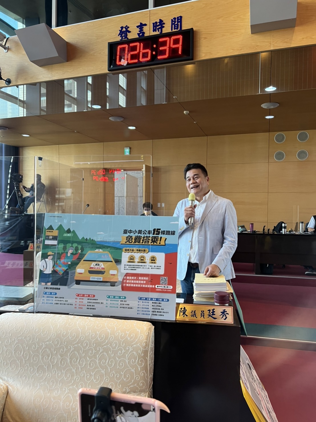台中市政府陳廷秀市政總質詢中大力讚賞台中市政府將小黃公車推廣至海線地區,大大提升海線地區之公共運輸。,台中市海線地區偏遠地區因人少、路小,公車實在是無法行駛,去年開始台中市政府創設小黃公車,利用計程車當公車,服務高齡者以及行動不便者。不同一般公車,小黃公車兼具免費、可預約、隨招隨停等優點,造福我們海線地區的長輩以及行動不便者。