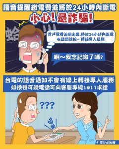 請民眾務必提高警覺,小心受騙!倘若民眾對於自家電費有任何疑問,均可洽詢台電公司24小時客服專線1911或各區營業處!