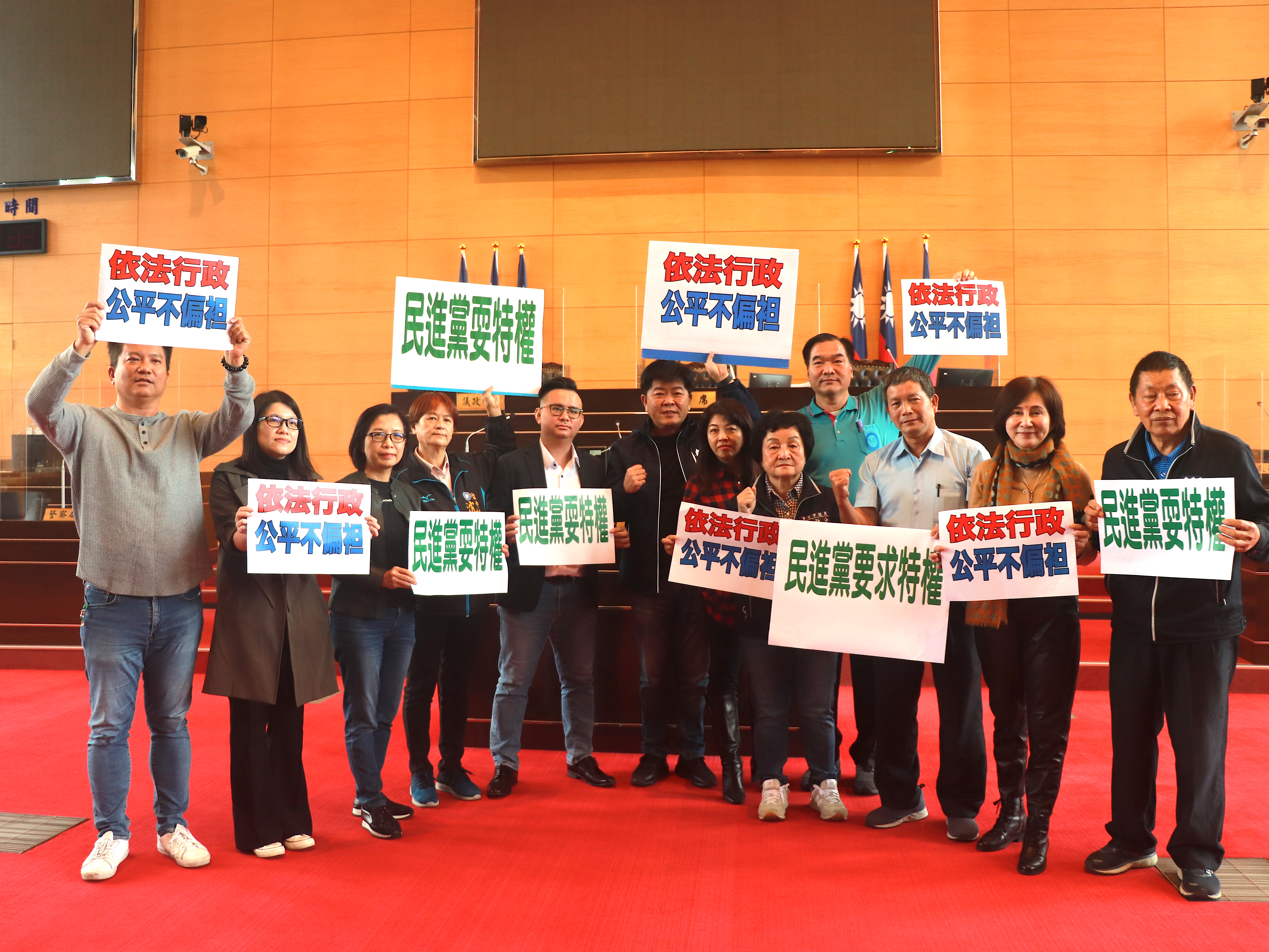 國民黨團議員在議場高喊「林靜儀要特權、民進黨耍特權」,要求市政府一定要依法行政,絕不能因為民進黨鴨霸的違法要求,就讓他們予取予求,台灣的民主得來不易,不允許民進黨惡搞。